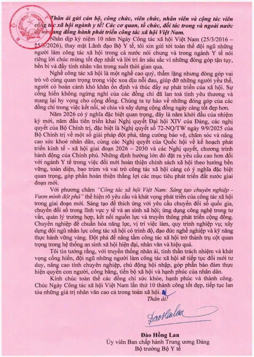 Nhân dịp kỷ niệm 10 năm Ngày Công tác xã hội Việt Nam (25/3/2016 – 25/3/2026), Bộ trưởng Bộ Y tế Đào Hồng Lan gửi tới toàn thể đội ngũ những người làm công tác xã hội trong cả nước nói chung và trong ngành Y tế nói riêng lời chúc mừng tốt đẹp nhất và lời tri ân sâu sắc vì những đóng góp tận tụy, bền bỉ và đầy tính nhân văn trong suốt thời gian qua.