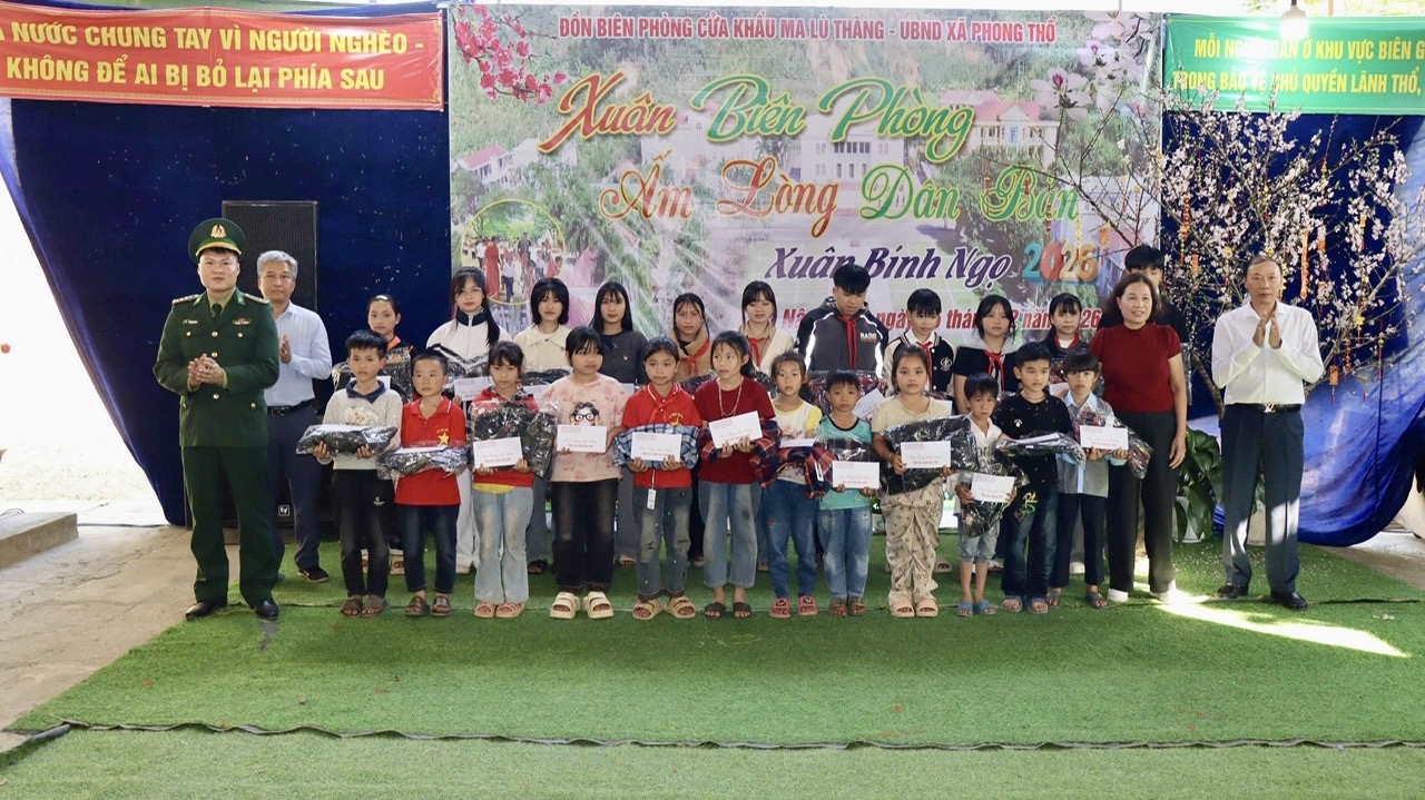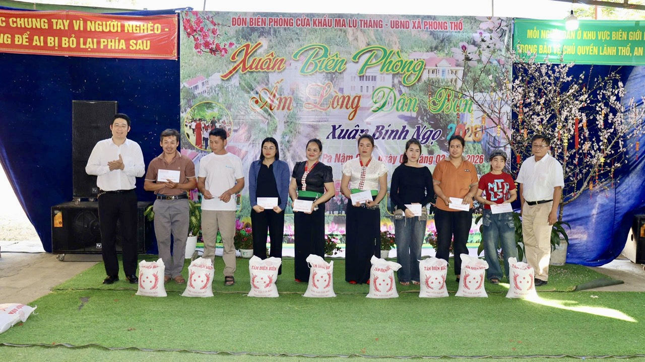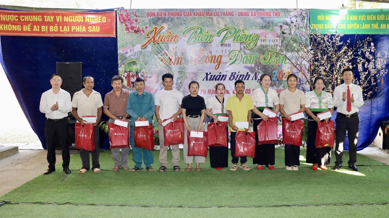 Chiều ngày 5/2, Đồn Biên phòng Cửa khẩu Ma Lù Thàng phối hợp với UBND xã Phong Thổ tổ chức Chương trình “Xuân Biên phòng ấm lòng dân bản” xuân Bính Ngọ 2026 tại bản Pa Nậm Cúm. Tham dự Chương trình có đồng chí Đinh Quang Tuấn - Ủy viên Ban Chấp hành Đảng bộ tỉnh, Bí thư Đảng ủy, Chủ tịch HĐND xã; đồng chí Đào Đức Định – UVBTV Đảng ủy, Phó Chủ tịch HĐND xã; đồng chí Trịnh Khắc Tấn - Ủy viên Ban Thường vụ Đảng ủy, Phó Chủ tịch UBND xã; đại diện lãnh đạo Ban quản lý khu Kinh tế cửa khẩu; cán bộ, chiến sĩ Đồn Biên phòng Cửa khẩu Ma Lù Thàng, các đơn vị đồng hành cùng đông đảo Nhân dân bản Pa Nậm Cúm.