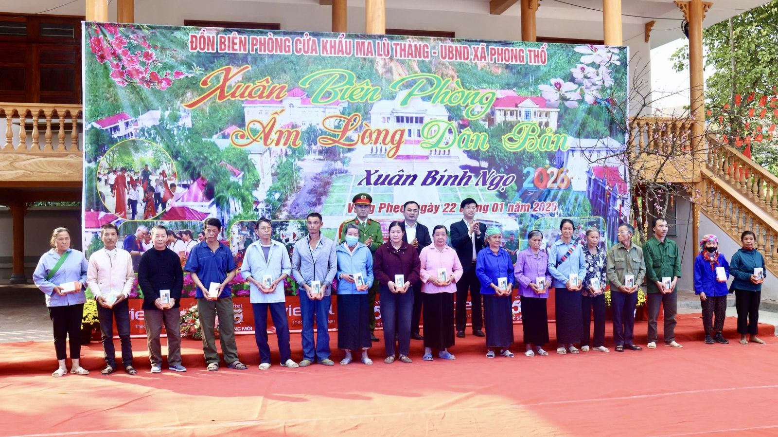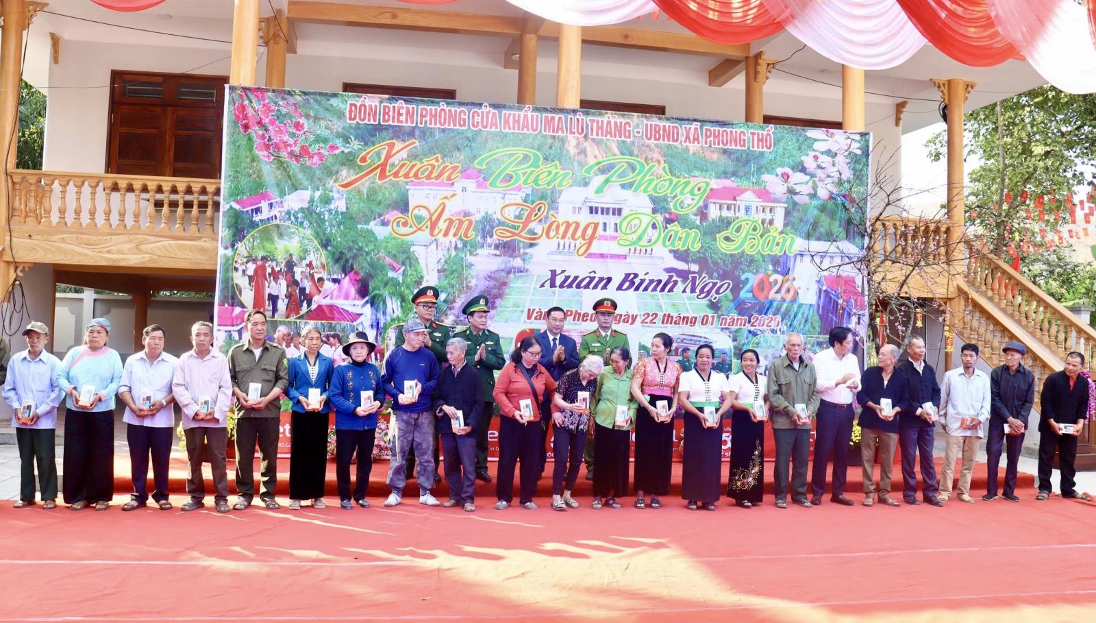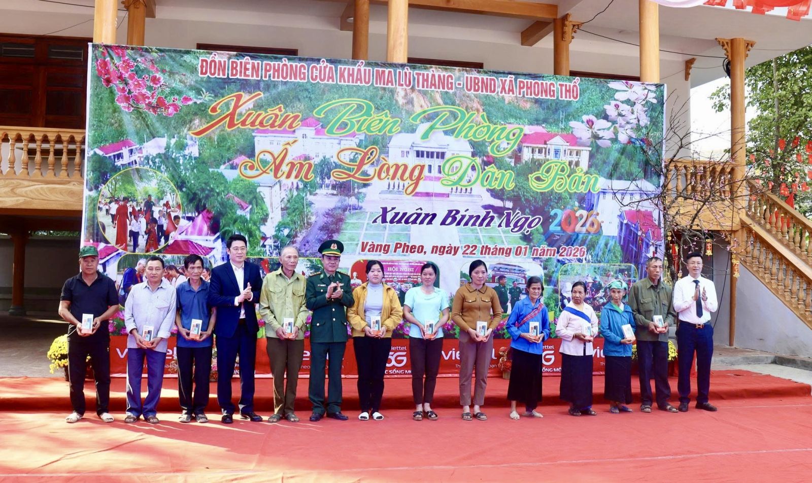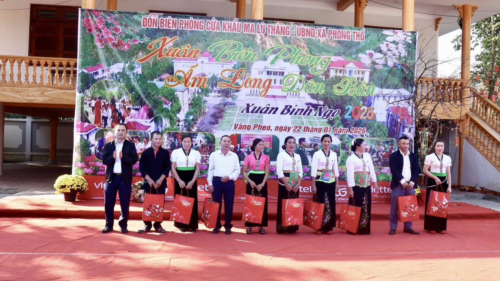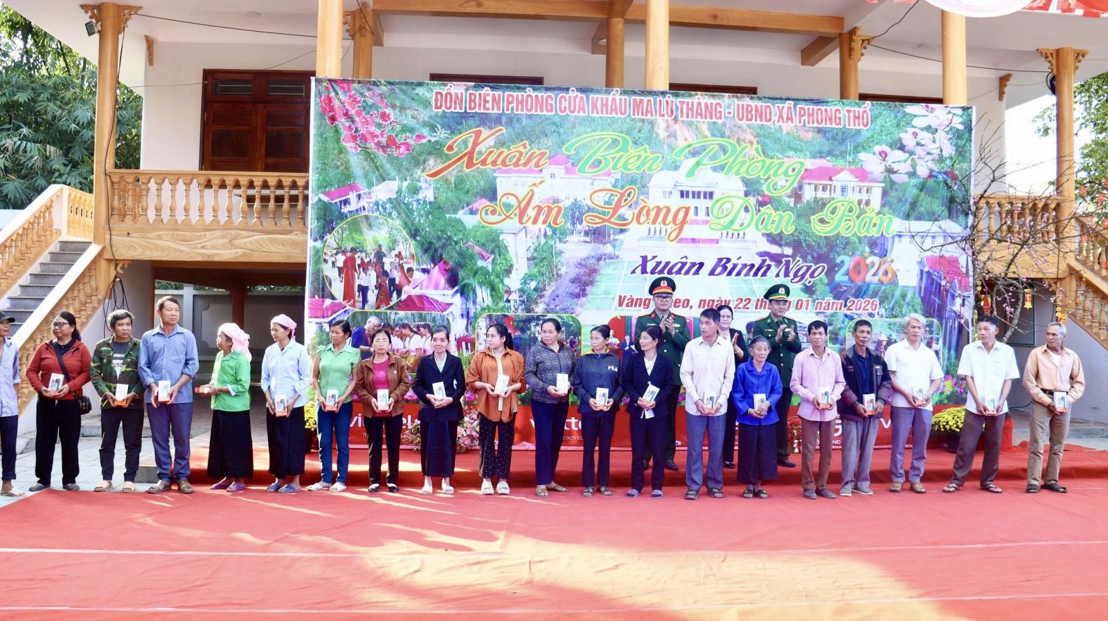 Ngày 22/1, tại Nhà văn hóa bản Vàng Pheo, UBND xã Phong Thổ phối hợp với Đồn Biên phòng Cửa khẩu Ma Lù Thàng tổ chức điểm Chương trình “Xuân Biên phòng ấm lòng dân bản” nhân dịp Tết Nguyên đán Bính Ngọ 2026. Dự và chỉ đạo có đồng chí Tống Thanh Bình - Ủy viên Ban Thường vụ Tỉnh ủy, Phó Chủ tịch Thường trực Ủy ban MTTQ Việt Nam tỉnh; đại diện lãnh đạo Sở Dân tộc và Tôn giáo, Ban Chỉ huy Bộ đội Biên phòng tỉnh; các đồng chí lãnh đạo Đảng ủy, HĐND, UBND, Ủy ban MTTQ xã Phong Thổ, đại diện lãnh đạo các xã: Khổng Lào, Sin Suối Hồ, Dào San, Sì Lở Lầu, các đơn vị đồng hành cùng đông đảo Nhân dân bản Vàng Pheo.