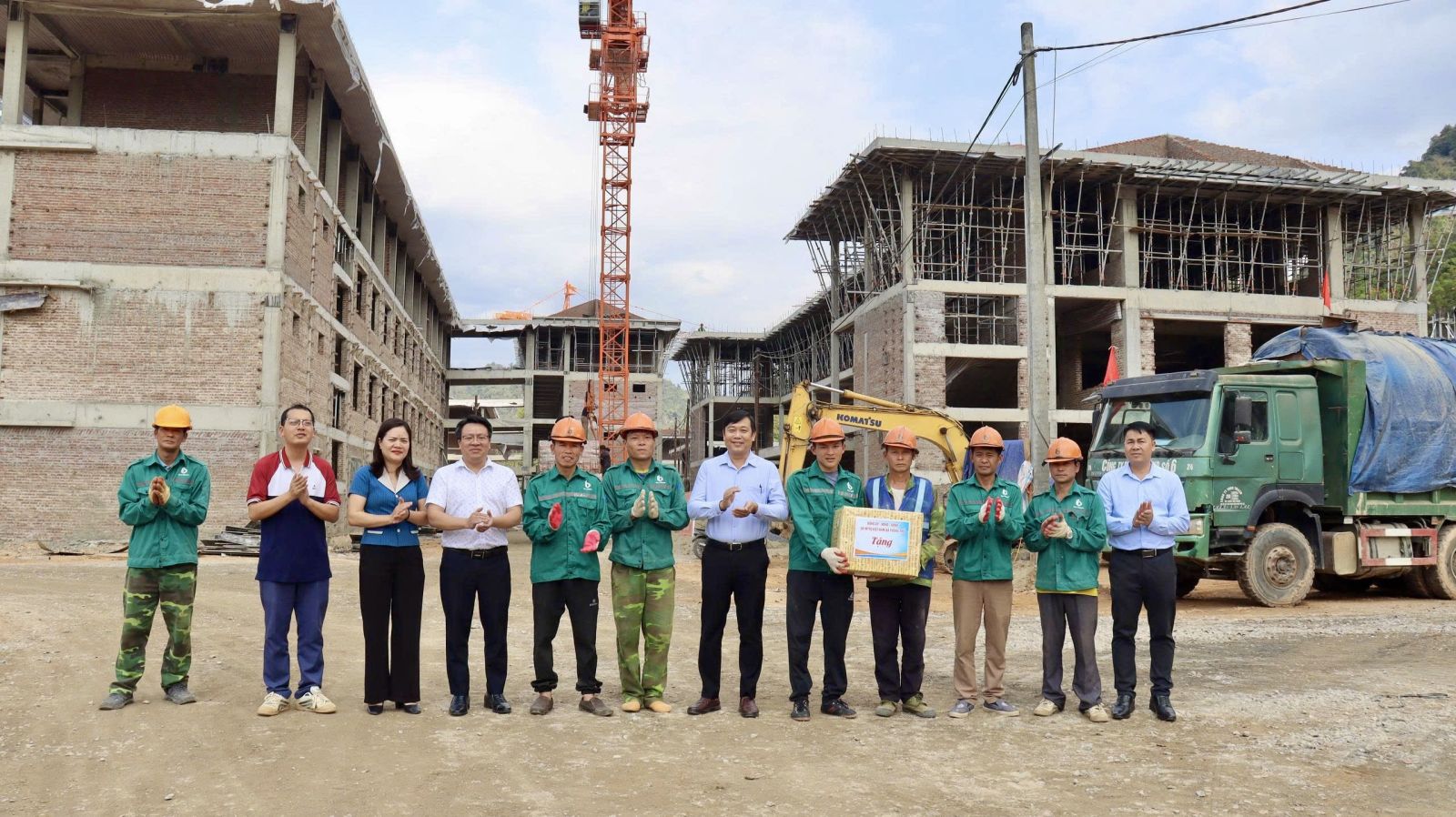 Tiếp đó, Đoàn đã đến thăm, tặng quà và động viên đơn vị thi công đang triển khai thực hiện Dự án tại công trình Trường Phổ thông nội trú liên cấp Tiểu học và THCS Phong Thổ. Đồng chí Đinh Quang Tuấn - Bí thư Đảng ủy, Chủ tịch HĐND xã ghi nhận tinh thần khẩn trương bắt tay vào công việc của chủ đầu tư và công nhân ngay sau kỳ nghỉ Tết, đồng thời đề nghị các đơn vị tiếp tục tập trung nhân lực, máy móc, đẩy nhanh tiến độ thi công, bảo đảm chất lượng và an toàn lao động, sớm hoàn thành công trình đưa vào sử dụng, góp phần nâng cao chất lượng giáo dục trên địa bàn.