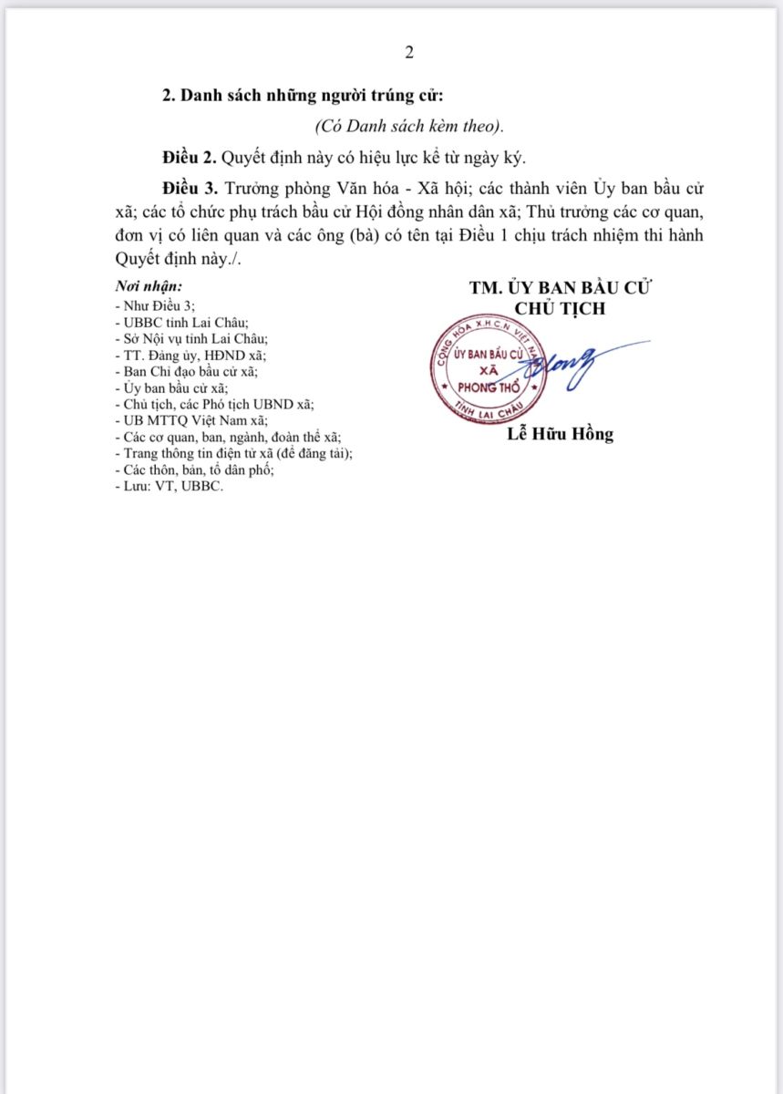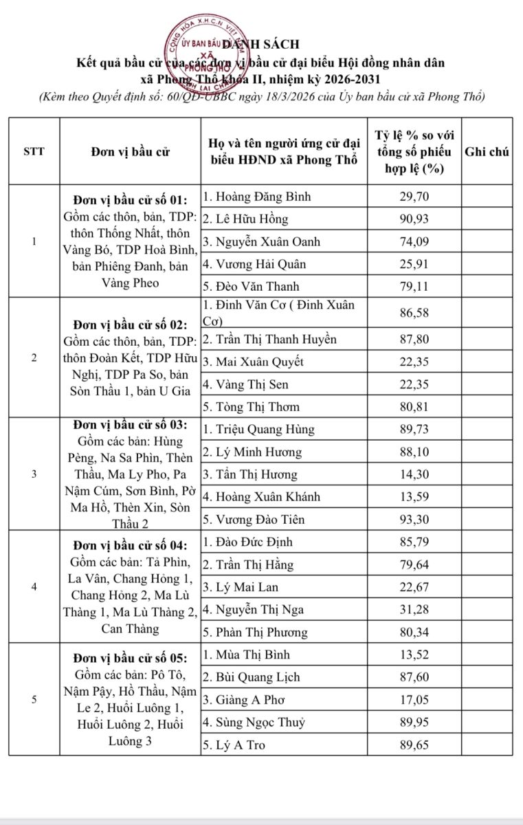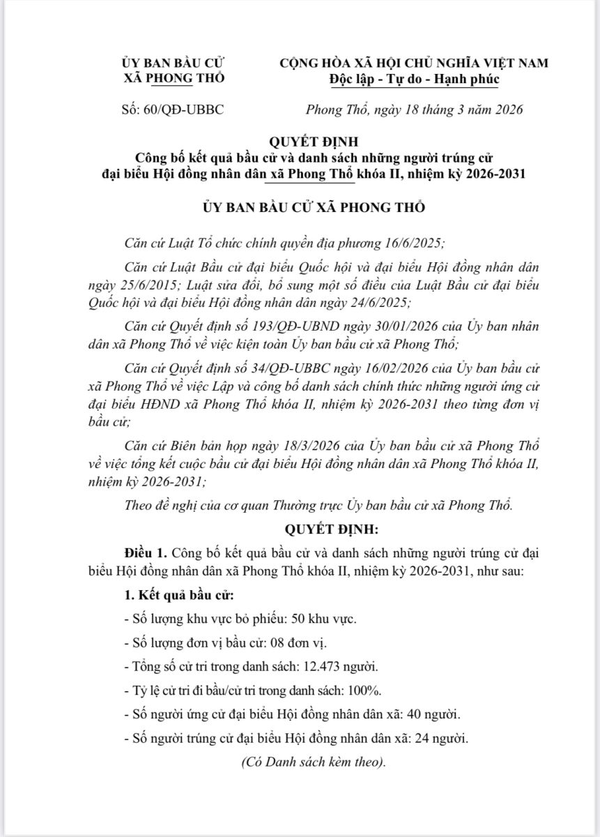 Quyết định về việc công bố kết quả bầu cử và danh sách những người trúng cử đại biểu Hội đồng nhân dân xã Phong Thổ khóa II, nhiệm kỳ 2026-203