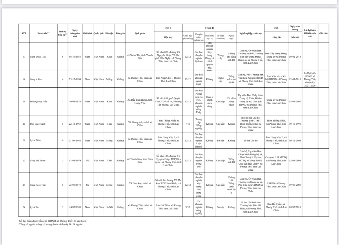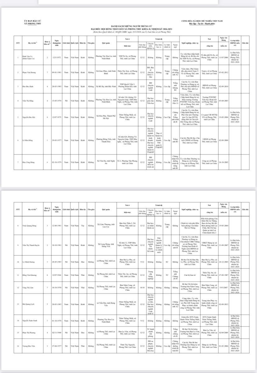 Căn cứ kết quả bầu cử, Ủy ban bầu cử xã đã công bố danh sách 24 đại biểu trúng cử HĐND xã Phong Thổ khóa II, nhiệm kỳ 2026 - 2031. Các đại biểu trúng cử bảo đảm cơ cấu, thành phần, đại diện cho các dân tộc, lĩnh vực và địa bàn dân cư trong xã.