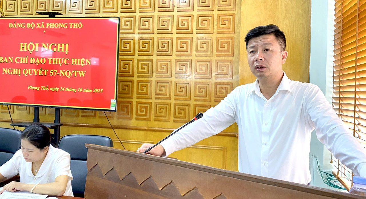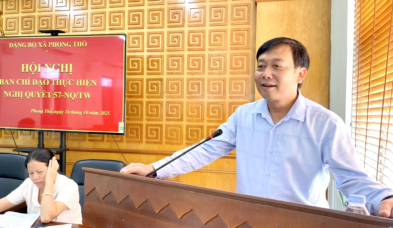 Sáng 24/10, Ban chỉ đạo thực hiện Nghị quyết 57-NQ/TW về đột phá phát triển khoa học, công nghệ, đổi mới sáng tạo và chuyển đổi số quốc gia xã Phong Thổ tổ chức Hội nghị sơ kết quý III, nhiệm vụ, giải pháp trọng tâm quý IV. Các đồng chí: Đinh Quang Tuấn - UVBCH Đảng bộ tỉnh, Bí thư Đảng ủy, Chủ tịch HĐND xã; Vương Đào Tiên – Phó Bí thư Thường trực Đảng ủy xã; Lê Hữu Hồng – Phó Bí thư Đảng ủy, Chủ tịch UBND xã đồng chủ trì Hội nghị.
