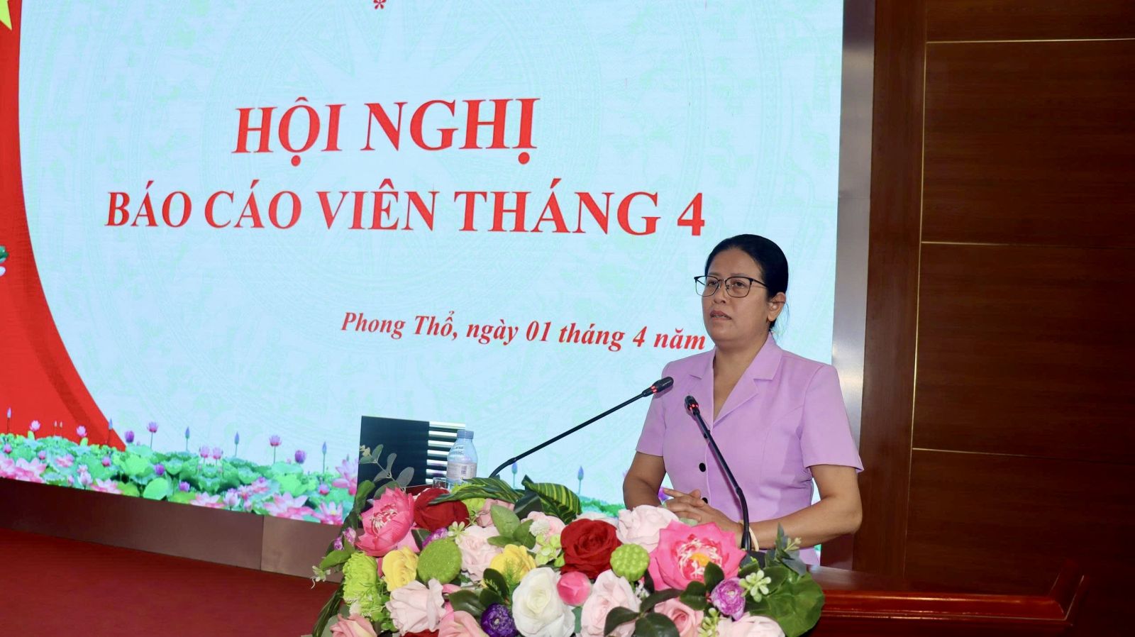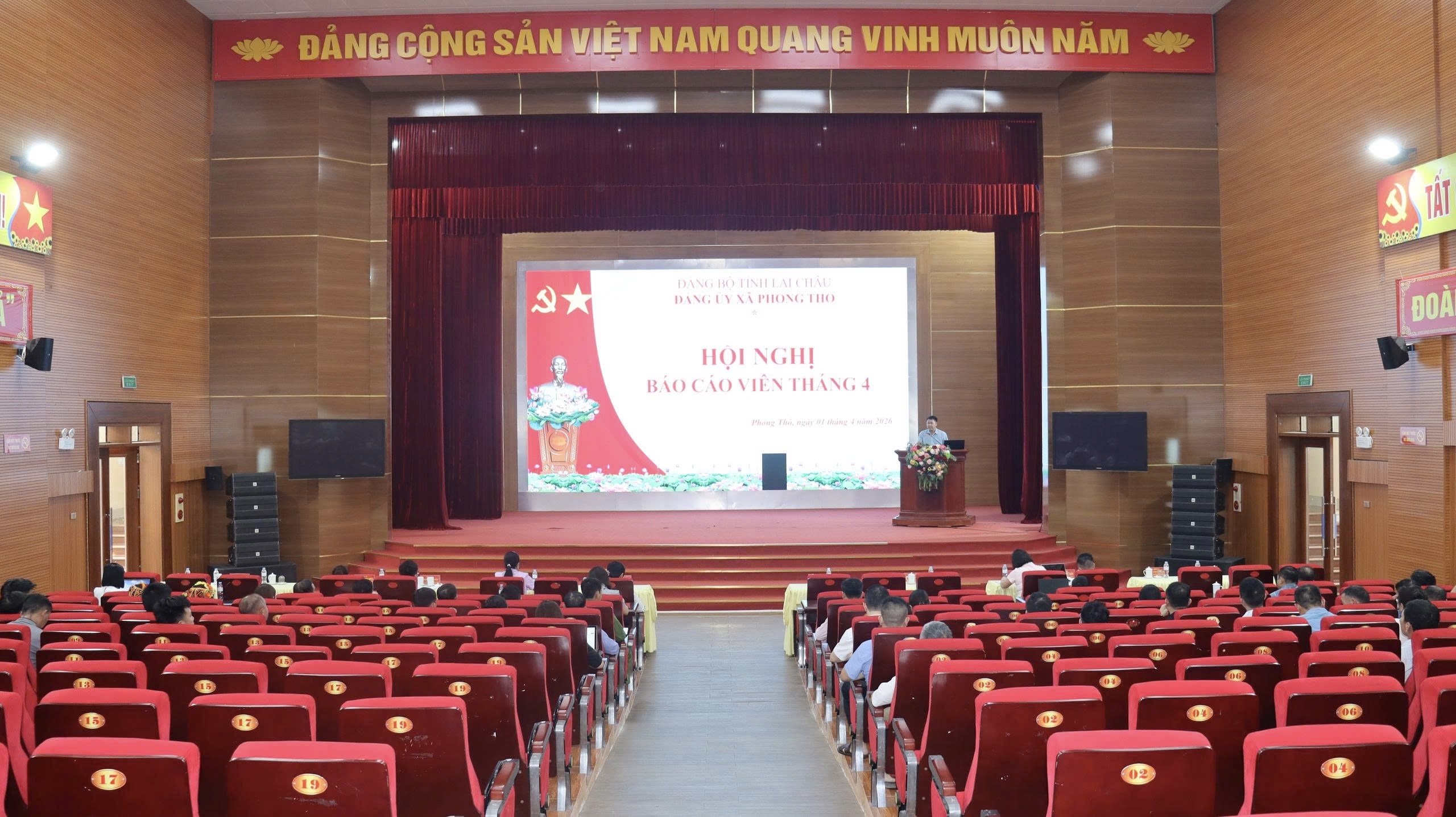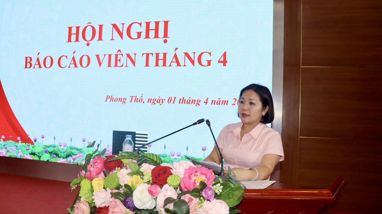 Chiều 1/4, Đảng ủy xã Phong Thổ tổ chức Hội nghị Báo cáo viên tháng 4 năm 2026, nhằm kịp thời thông tin, định hướng tuyên truyền những nội dung quan trọng phục vụ công tác lãnh đạo, chỉ đạo trong thời gian tới. Tham dự hội nghị có đồng chí Đinh Quang Tuấn - Ủy viên Ban Chấp hành Đảng bộ tỉnh, Bí thư Đảng ủy, Chủ tịch HĐND xã; đồng chí Vương Đào Tiên - Phó Bí thư Thường trực Đảng ủy xã; các đồng chí trong Ban Thường vụ Đảng ủy, báo cáo viên cấp tỉnh của xã, báo cáo viên của Đảng ủy xã; lãnh đạo các phòng ban, cơ quan, đơn vị, bí thư các tổ chức đảng trực thuộc.