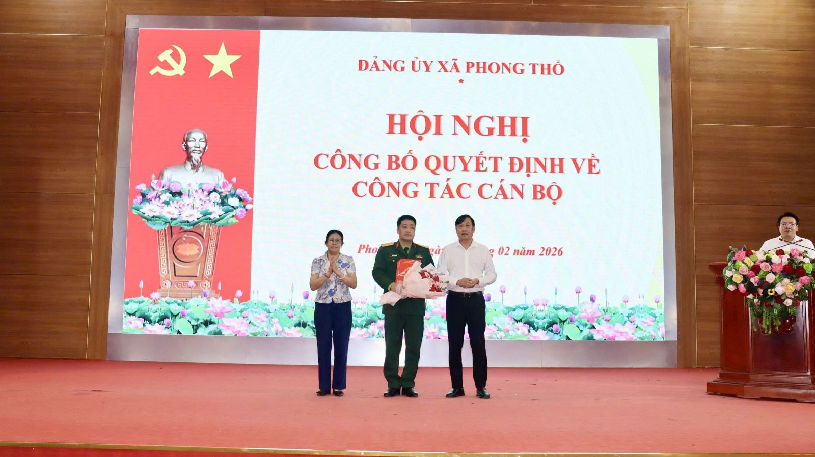 Tại hội nghị, đại diện lãnh đạo Ban Xây dựng Đảng Đảng ủy xã đã Công bố Quyết định của Ban Thường vụ Tỉnh ủy cho thôi tham gia Ban Chấp hành, Ban Thường vụ Đảng ủy xã Phong Thổ nhiệm kỳ 2025-2030; Quyết định chỉ định tham gia Ban Chấp hành, Ban Thường vụ Đảng ủy xã Phong Thổ nhiệm kỳ 2025-2030. Theo Quyết định cho thôi tham gia Ban Chấp hành, Ban Thường vụ Đảng ủy xã Phong Thổ nhiệm kỳ 2025-2030 đối với đồng chí Hoàng Văn Cường - Công chức Ban Chỉ huy Quân sự xã Phong Thổ; Chỉ định đồng chí Nguyễn Chung Tấn - Chỉ huy trưởng Ban Chỉ huy Quân sự xã Phong Thổ tham gia Ban Chấp hành, Ban Thường vụ Đảng ủy xã Phong Thổ nhiệm kỳ 2025-2030.