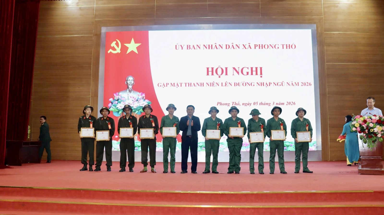 Sáng ngày 05/3, xã Phong Thổ tổ chức gặp mặt thanh niên lên đường nhập ngũ năm 2026. Dự buổi gặp mặt có đồng chí Lê Hữu Hồng – Phó Bí thư Đảng ủy, Chủ tịch UBND xã, Chủ tịch Hội đồng nghĩa vụ Quân sự xã; đồng chí Đào Đức Định - Ủy viên Ban Thường vụ Đảng ủy, Phó Chủ tịch HĐND xã; đại diện lãnh đạo các phòng, ban, cơ quan, đơn vị.