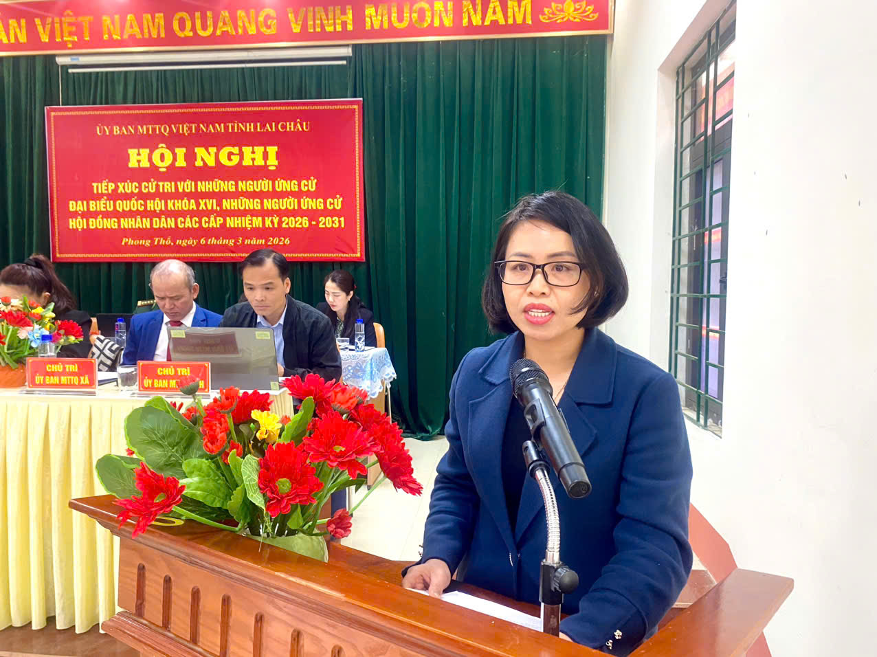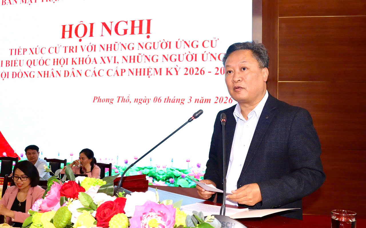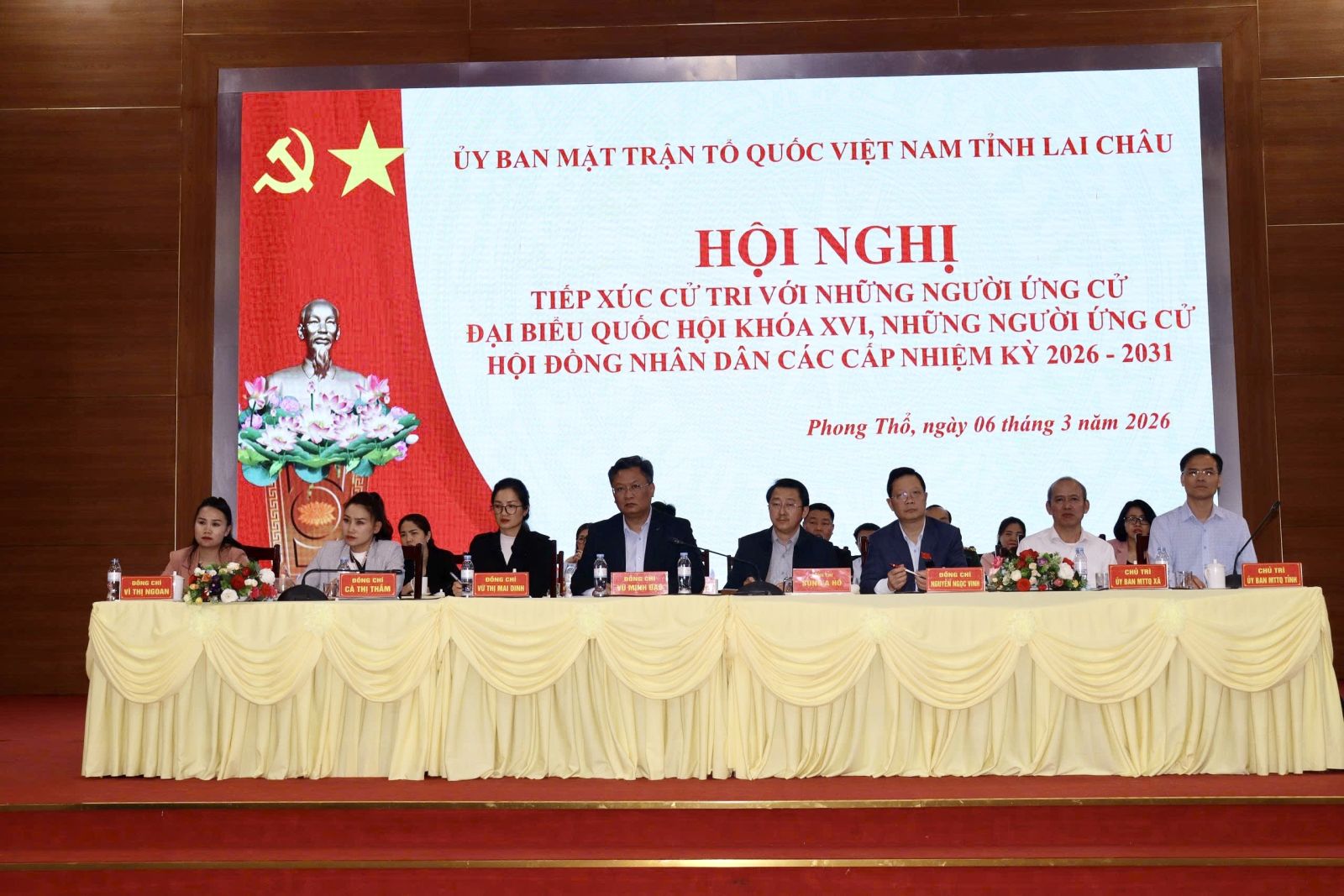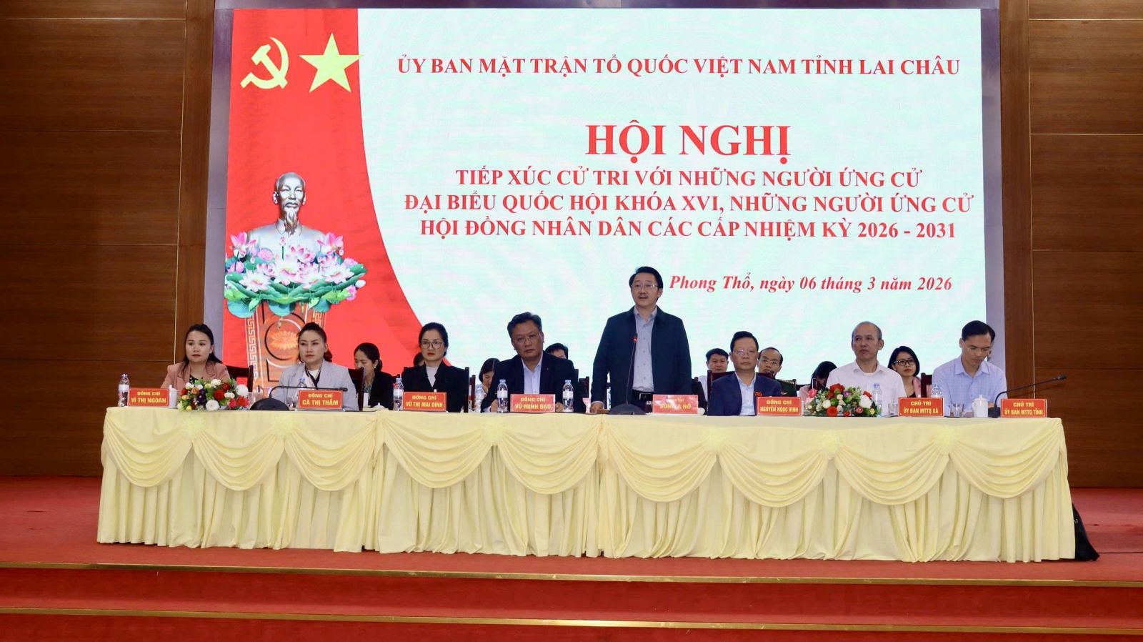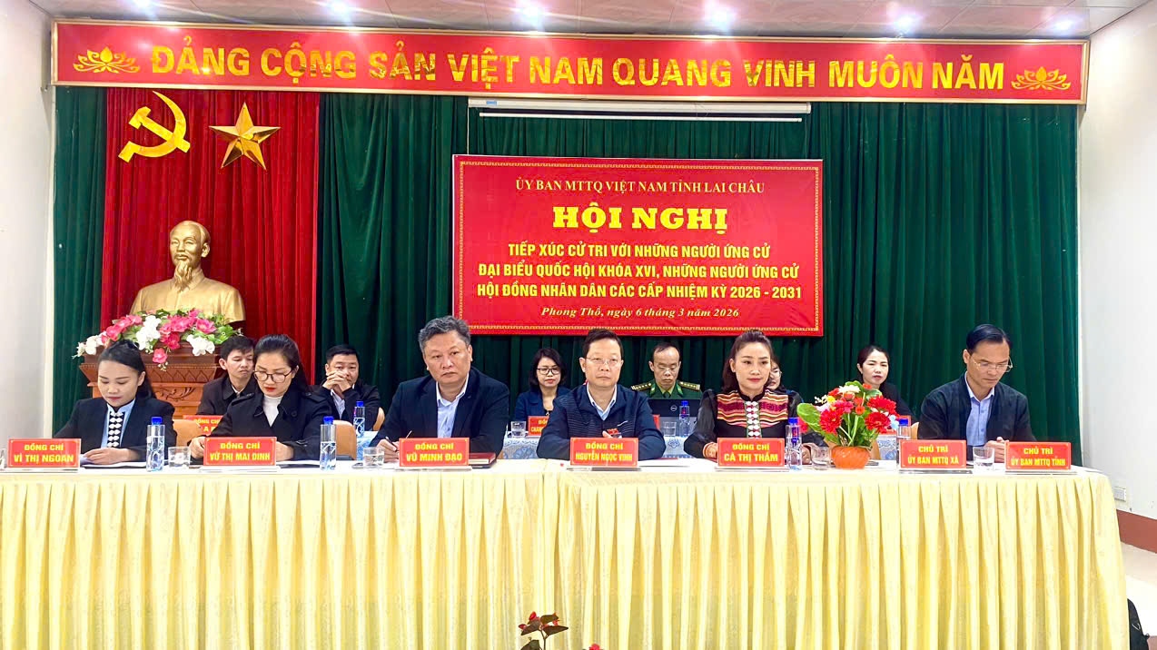 Ngày 6/3, Ban Thường trực Ủy ban Mặt trận tổ quốc (MTTQ) Việt Nam tỉnh chủ trì, phối hợp với Đảng ủy, HĐND, UBND, Ủy ban Bầu cử và Ủy ban MTTQ Việt Nam xã Phong Thổ tổ chức Hội nghị tiếp xúc cử tri vận động bầu cử của những người ứng cử đại biểu Quốc hội khóa XVI và đại biểu HĐND các cấp nhiệm kỳ 2026–2031.Dự hội nghị có các đồng chí: Sùng A Hồ - Phó Bí Thư Thường trực Tỉnh ủy Lai Châu; Nguyễn Ngọc Vinh – Phó Bí thư Tỉnh ủy, Chủ tịch Ủy ban MTTQ Việt Nam tỉnh, Chủ nhiệm Ủy ban Kiểm tra Tỉnh ủy Lai Châu; Vũ Minh Đạo – Ủy viên Ban Chấp hành Đảng bộ Ủy ban Văn hóa và Xã hội, Bí thư Chi bộ, Vụ trưởng Vụ Văn hóa và Xã hội thuộc Ủy ban Văn hóa và Xã hội của Quốc hội; các đại biểu ứng cử đại biểu Quốc hội khóa XVI và đại biểu HĐND các cấp nhiệm kỳ 2026–2031; các đồng chí đại diện Thường trực Đảng ủy, HĐND, UBND, Ủy ban MTTQ Việt Nam xã Phong Thổ; cử tri khu vực Huổi Luông, Ma Li Pho và trung tâm xã Phong Thổ.