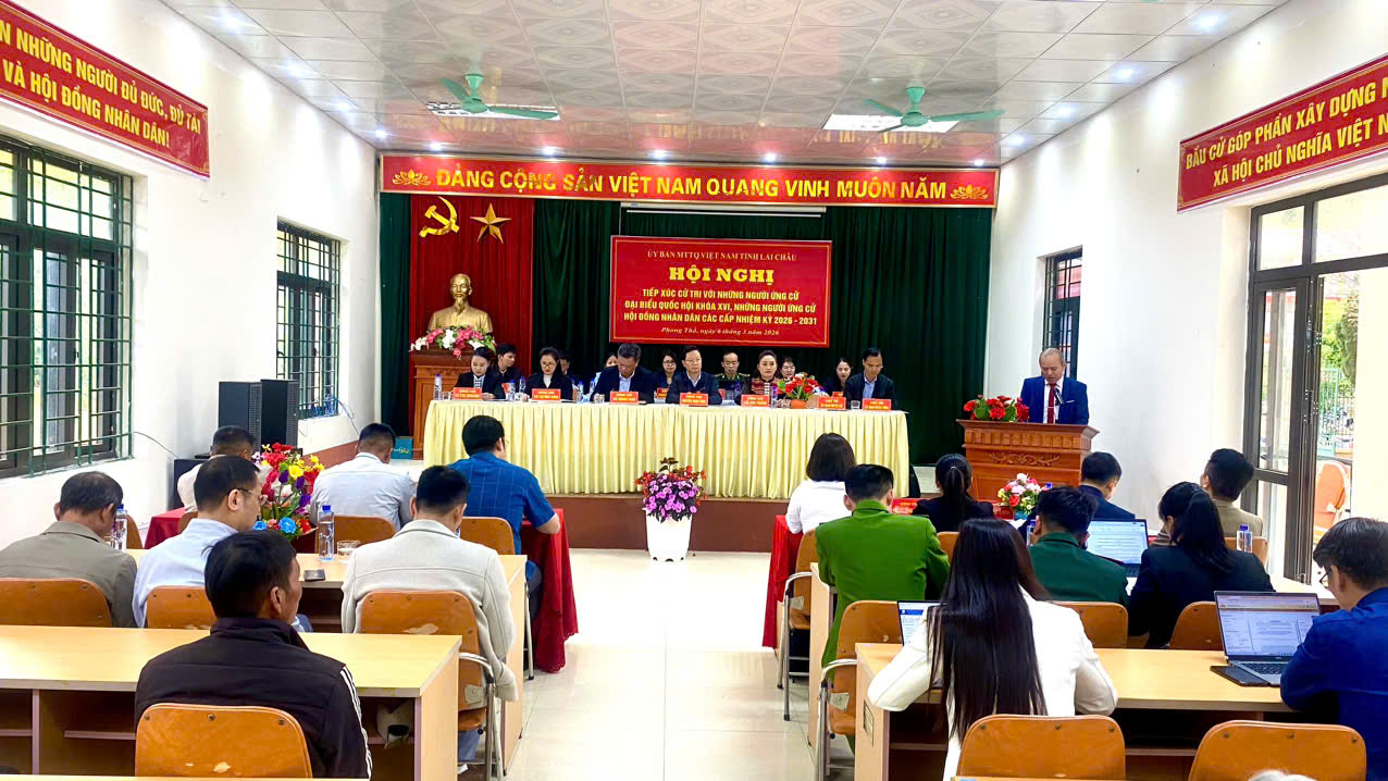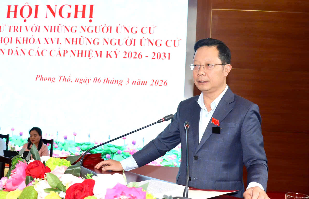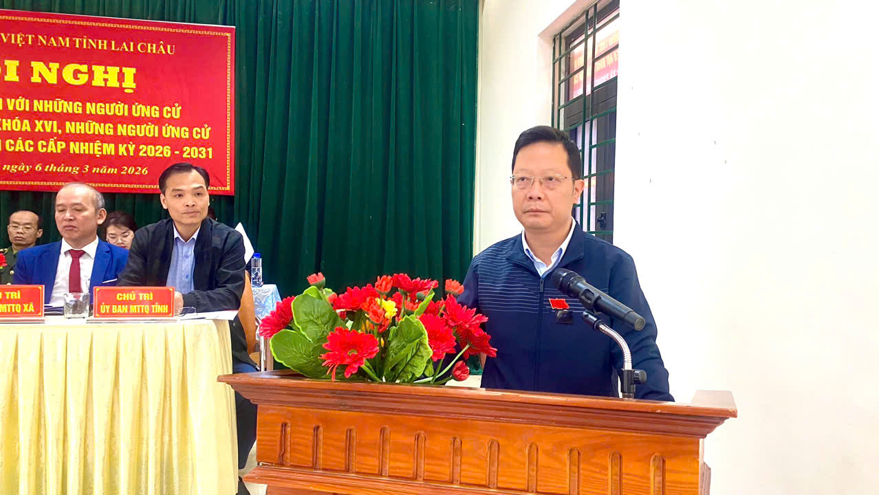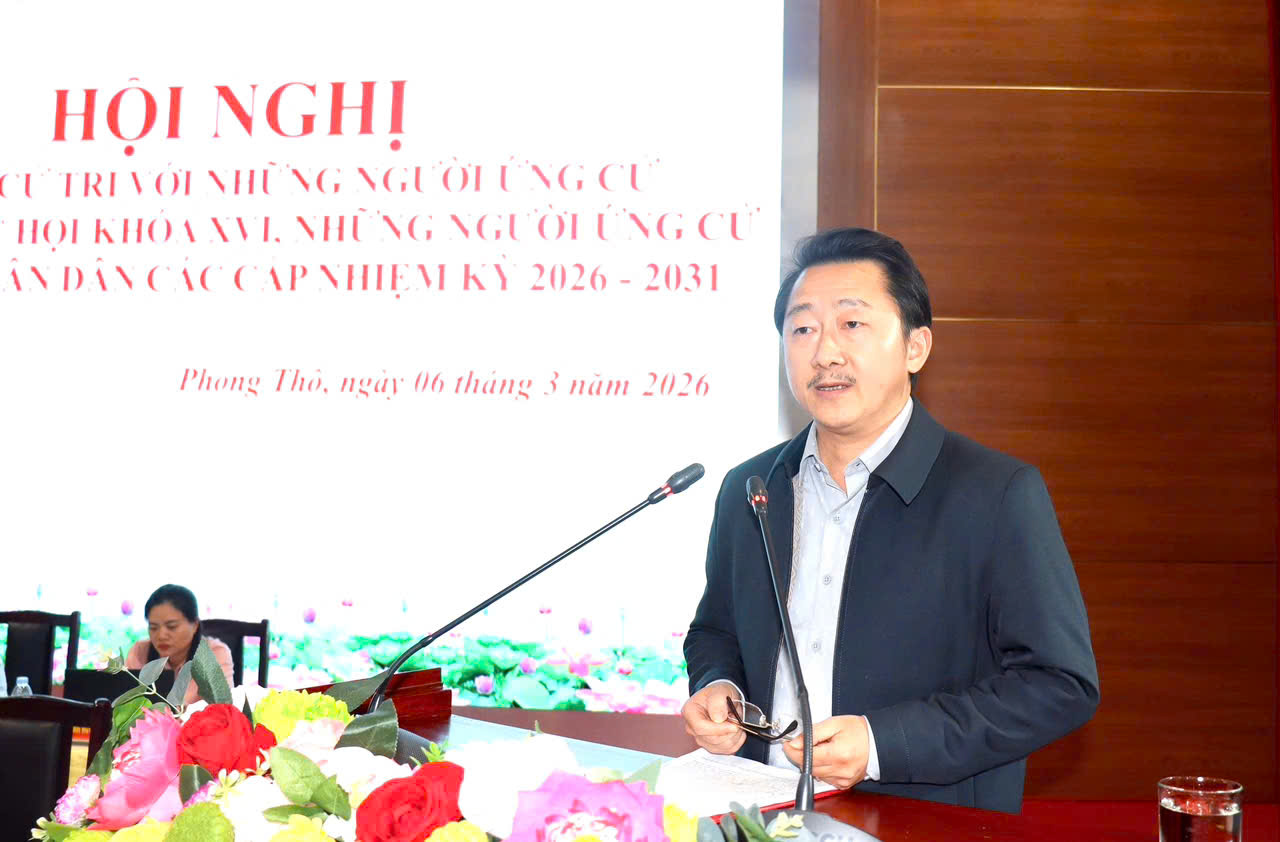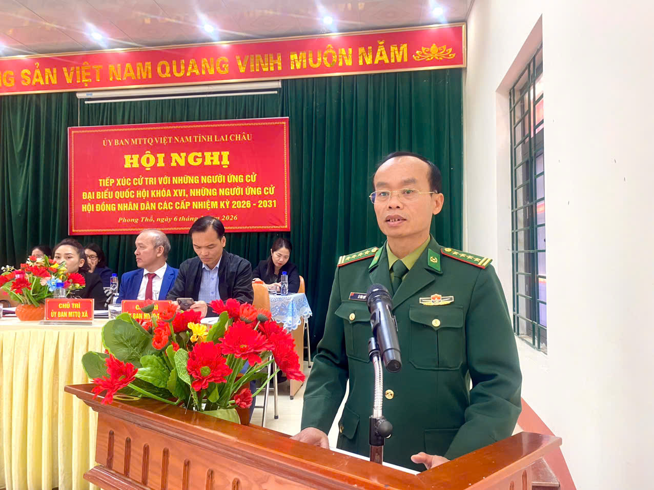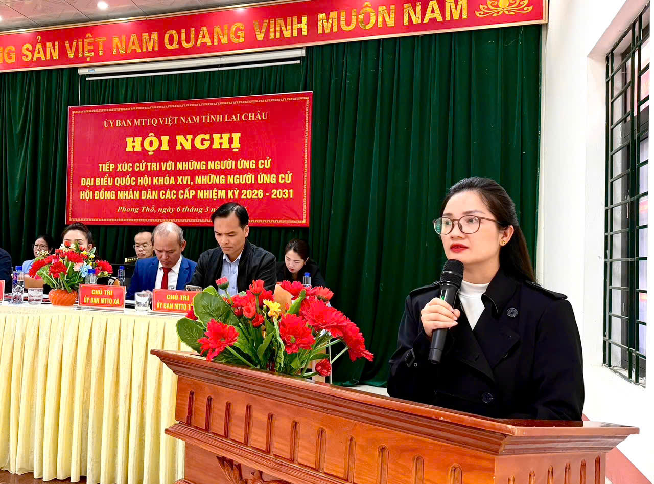 Ngày 6/3, Ban Thường trực Ủy ban Mặt trận tổ quốc (MTTQ) Việt Nam tỉnh chủ trì, phối hợp với Đảng ủy, HĐND, UBND, Ủy ban Bầu cử và Ủy ban MTTQ Việt Nam xã Phong Thổ tổ chức Hội nghị tiếp xúc cử tri vận động bầu cử của những người ứng cử đại biểu Quốc hội khóa XVI và đại biểu HĐND các cấp nhiệm kỳ 2026–2031.Dự hội nghị có các đồng chí: Sùng A Hồ - Phó Bí Thư Thường trực Tỉnh ủy Lai Châu; Nguyễn Ngọc Vinh – Phó Bí thư Tỉnh ủy, Chủ tịch Ủy ban MTTQ Việt Nam tỉnh, Chủ nhiệm Ủy ban Kiểm tra Tỉnh ủy Lai Châu; Vũ Minh Đạo – Ủy viên Ban Chấp hành Đảng bộ Ủy ban Văn hóa và Xã hội, Bí thư Chi bộ, Vụ trưởng Vụ Văn hóa và Xã hội thuộc Ủy ban Văn hóa và Xã hội của Quốc hội; các đại biểu ứng cử đại biểu Quốc hội khóa XVI và đại biểu HĐND các cấp nhiệm kỳ 2026–2031; các đồng chí đại diện Thường trực Đảng ủy, HĐND, UBND, Ủy ban MTTQ Việt Nam xã Phong Thổ; cử tri khu vực Huổi Luông, Ma Li Pho và trung tâm xã Phong Thổ.