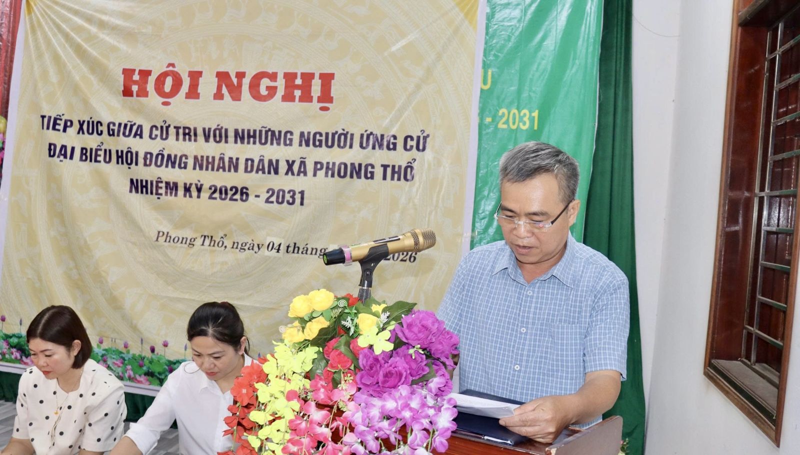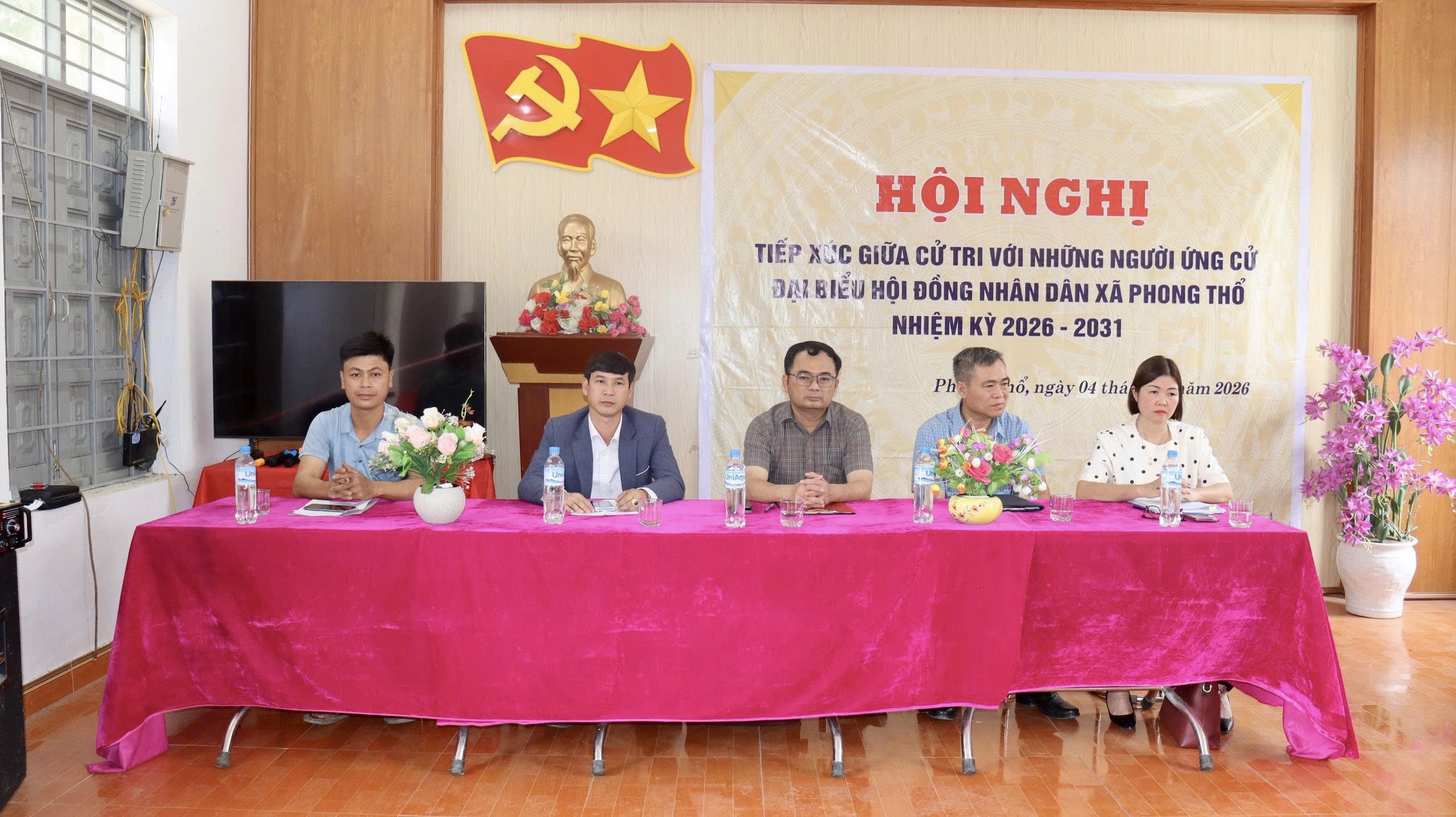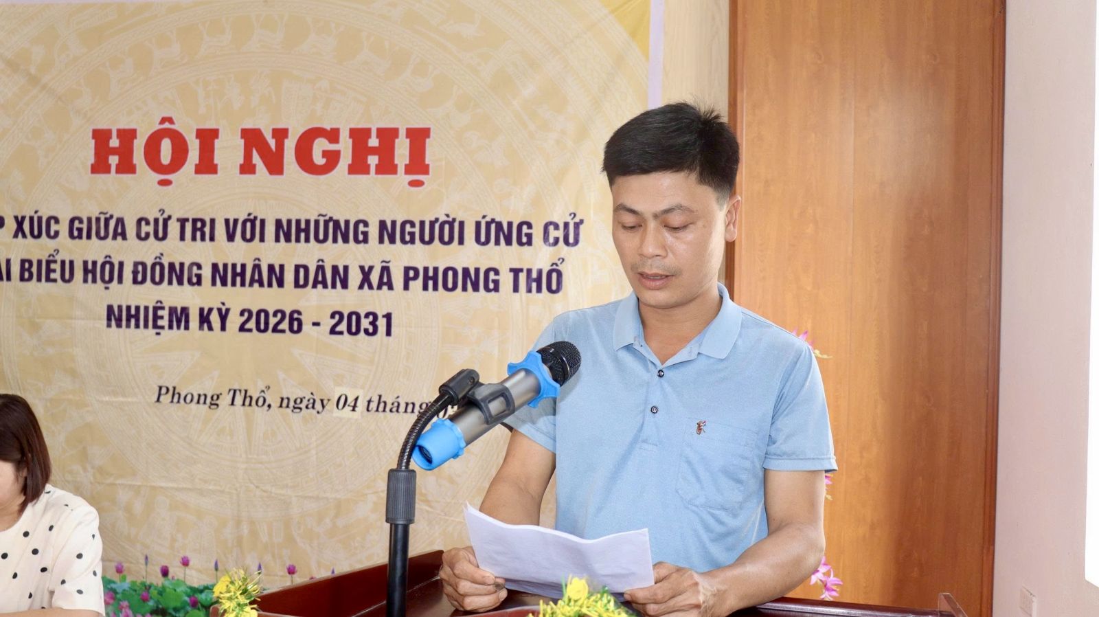 Tại hội nghị, đại diện Ủy ban MTTQ Việt Nam xã đã thông qua tiểu sử tóm tắt của các ứng cử viên đại biểu Hội đồng nhân dân xã Phong Thổ khóa II, nhiệm kỳ 2026–2031 gồm: Ông Lê Hữu Hồng – Phó Bí thư Đảng ủy, Chủ tịch UBND xã; ông Đèo Văn Thành – Phó Bí thư Chi bộ, Trưởng Ban công tác mặt trận thôn Thống Nhất; ông Vương Hải Quân – Chi hội trưởng Chi hội Cựu chiến binh thôn Thống Nhất; ông Nguyễn Xuân Oanh – Giám đốc Hợp tác xã Xuân Oanh; ông Hoàng Đăng Bình – Giám đốc Hợp tác xã Dương Yến, thực hiện việc tiếp xúc cử tri vận động bầu cử tại đơn vị bầu cử số 1 gồm: Tổ dân phố Hòa Bình, thôn Thống Nhất, thôn Vàng Bó, bản Phiêng Đanh và bản Vàng Pheo.
