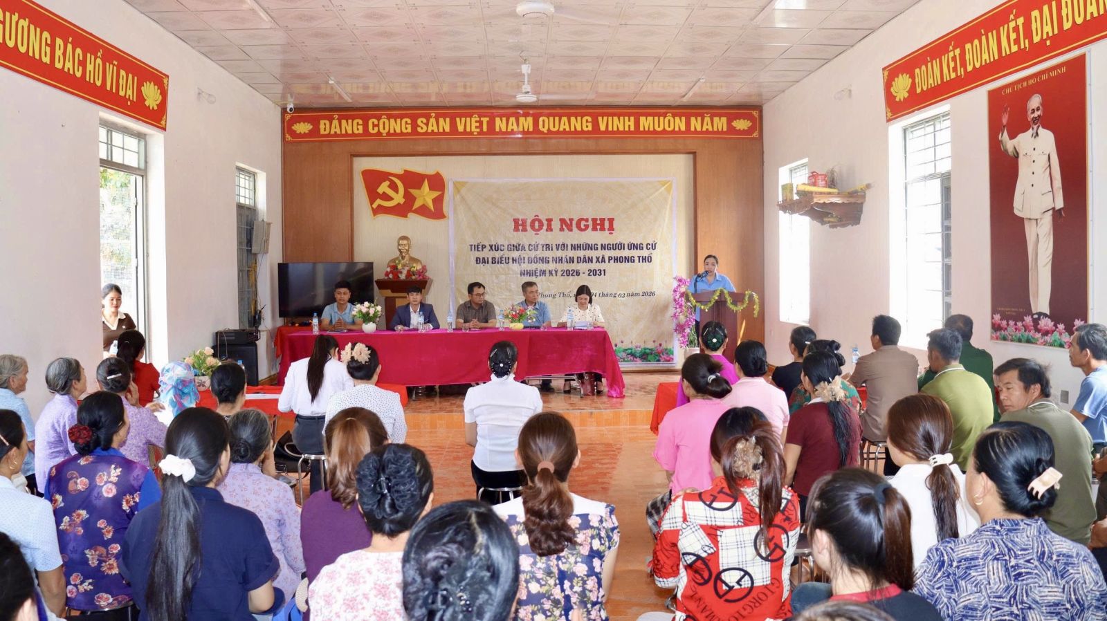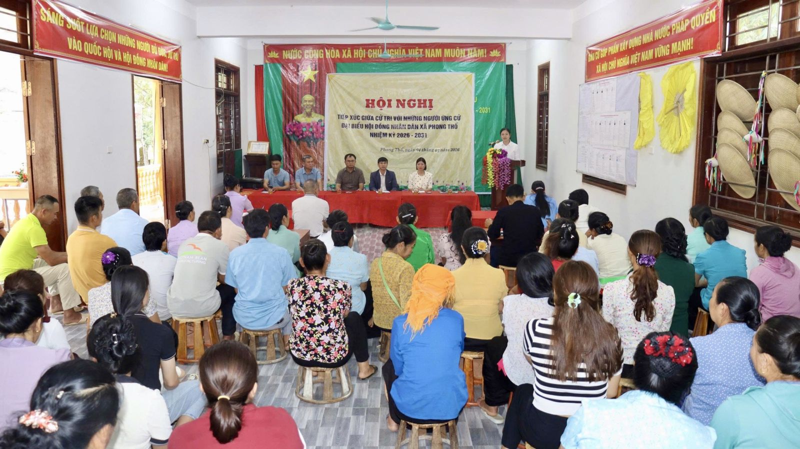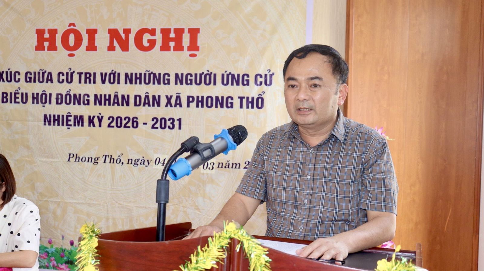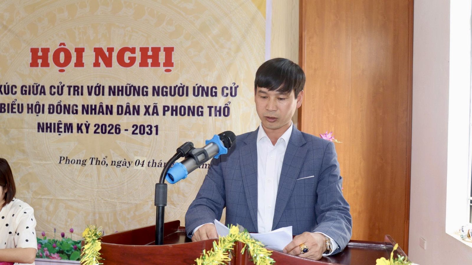 Tại hội nghị, đại diện Ủy ban MTTQ Việt Nam xã đã thông qua tiểu sử tóm tắt của các ứng cử viên đại biểu Hội đồng nhân dân xã Phong Thổ khóa II, nhiệm kỳ 2026–2031 gồm: Ông Lê Hữu Hồng – Phó Bí thư Đảng ủy, Chủ tịch UBND xã; ông Đèo Văn Thành – Phó Bí thư Chi bộ, Trưởng Ban công tác mặt trận thôn Thống Nhất; ông Vương Hải Quân – Chi hội trưởng Chi hội Cựu chiến binh thôn Thống Nhất; ông Nguyễn Xuân Oanh – Giám đốc Hợp tác xã Xuân Oanh; ông Hoàng Đăng Bình – Giám đốc Hợp tác xã Dương Yến, thực hiện việc tiếp xúc cử tri vận động bầu cử tại đơn vị bầu cử số 1 gồm: Tổ dân phố Hòa Bình, thôn Thống Nhất, thôn Vàng Bó, bản Phiêng Đanh và bản Vàng Pheo.