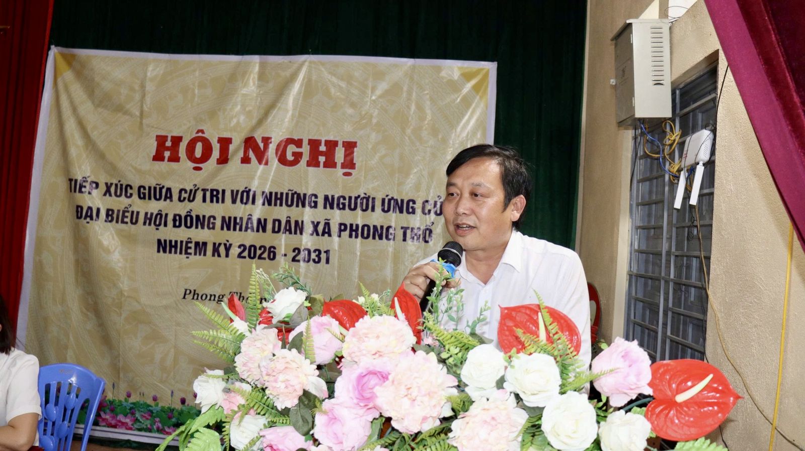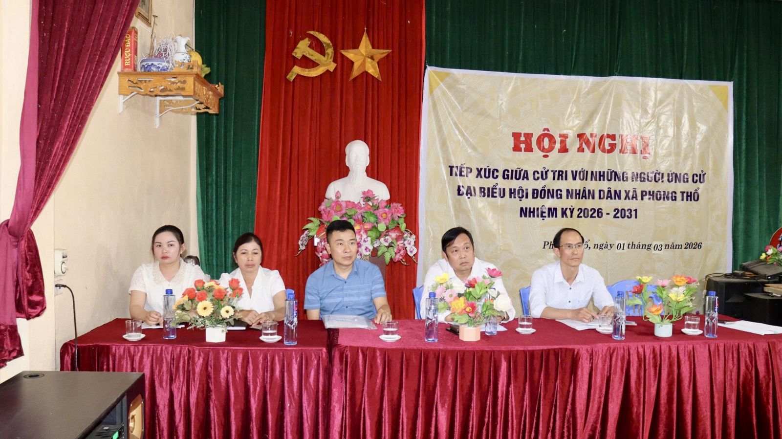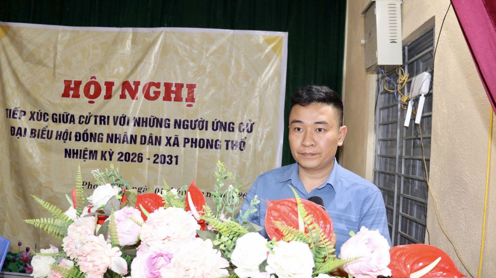 Tại hội nghị, đại diện Ủy ban MTTQ Việt Nam xã đã thông qua tiểu sử tóm tắt của các ứng cử viên đại biểu Hội đồng nhân dân xã Phong Thổ khóa II, nhiệm kỳ 2026–2031 gồm: Ông Đinh Quang Tuấn – Ủy viên Ban Chấp hành Đảng bộ tỉnh, Bí thư Đảng ủy, Chủ tịch HĐND xã; ông Phạm Ngọc Dương – Phó Giám đốc Tram Y tế xã, ông Nguyễn Đình Sơn – Viên chức Trạm Y tế xã bà Vàng Thị Lâm – Bí thư Chi bộ, Trưởng bản Nậm Cung; bà Lù Thị Thặm - Chi hội trưởng Chi hội Phụ nữ bản Nậm Cung, thực hiện việc tiếp xúc cử tri vận động bầu cử tại đơn vị bầu cử số 7 gồm: thôn Tây sơn, thôn Tây Nguyên, bản Nậm Cung và bản Nà Củng.
