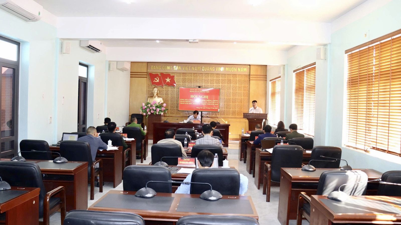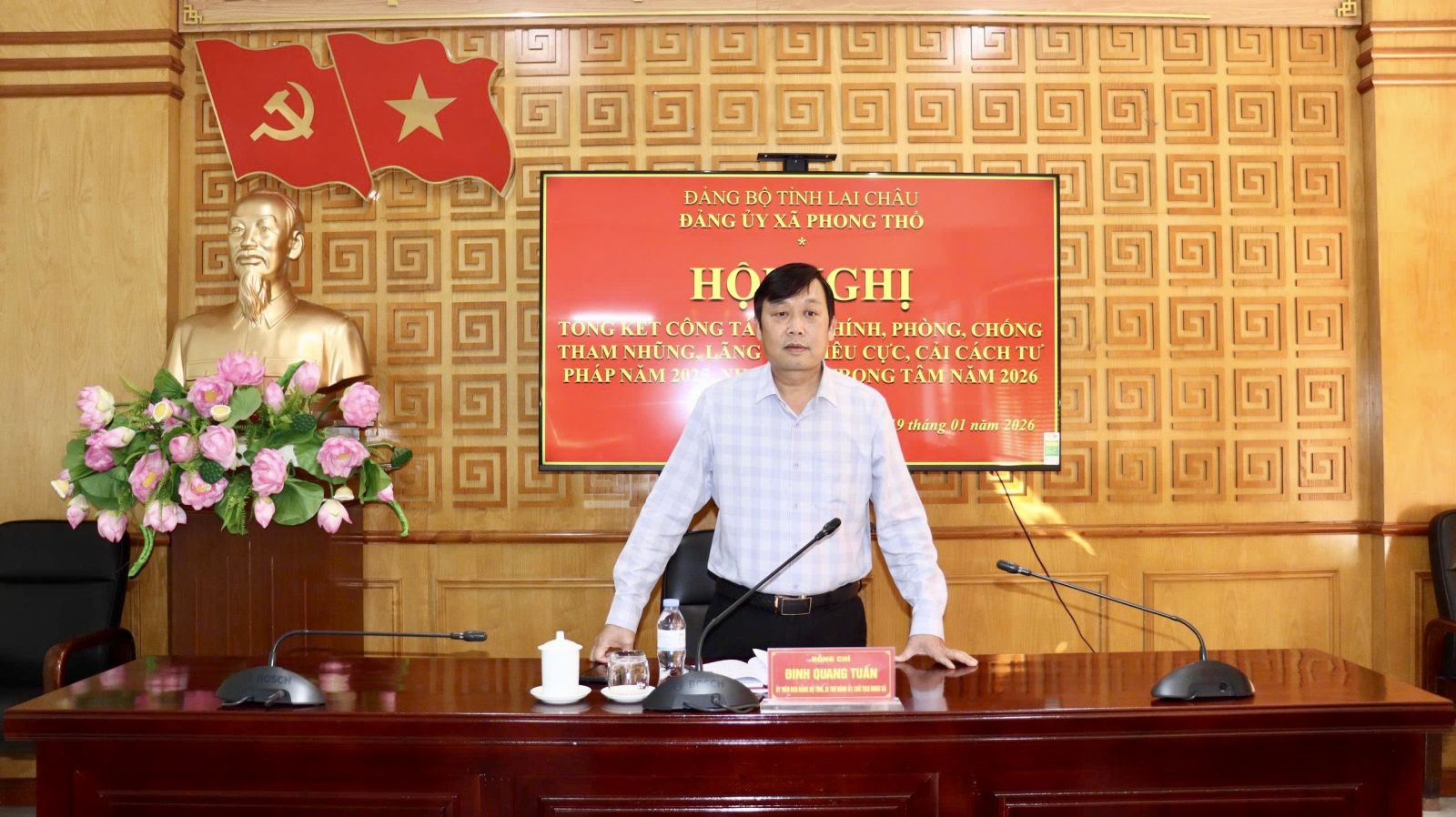 Chiều 19/1, xã Phong Thổ tổ chức Hội nghị tổng kết công tác nội chính, phòng, chống tham nhũng, lãng phí, tiêu cực và cải cách tư pháp năm 2025; triển khai nhiệm vụ trọng tâm năm 2026. Đồng chí Đinh Quang Tuấn - Ủy viên Ban Chấp hành Đảng bộ tỉnh, Bí thư Đảng ủy, Chủ tịch HĐND xã chủ trì Hội nghị.
