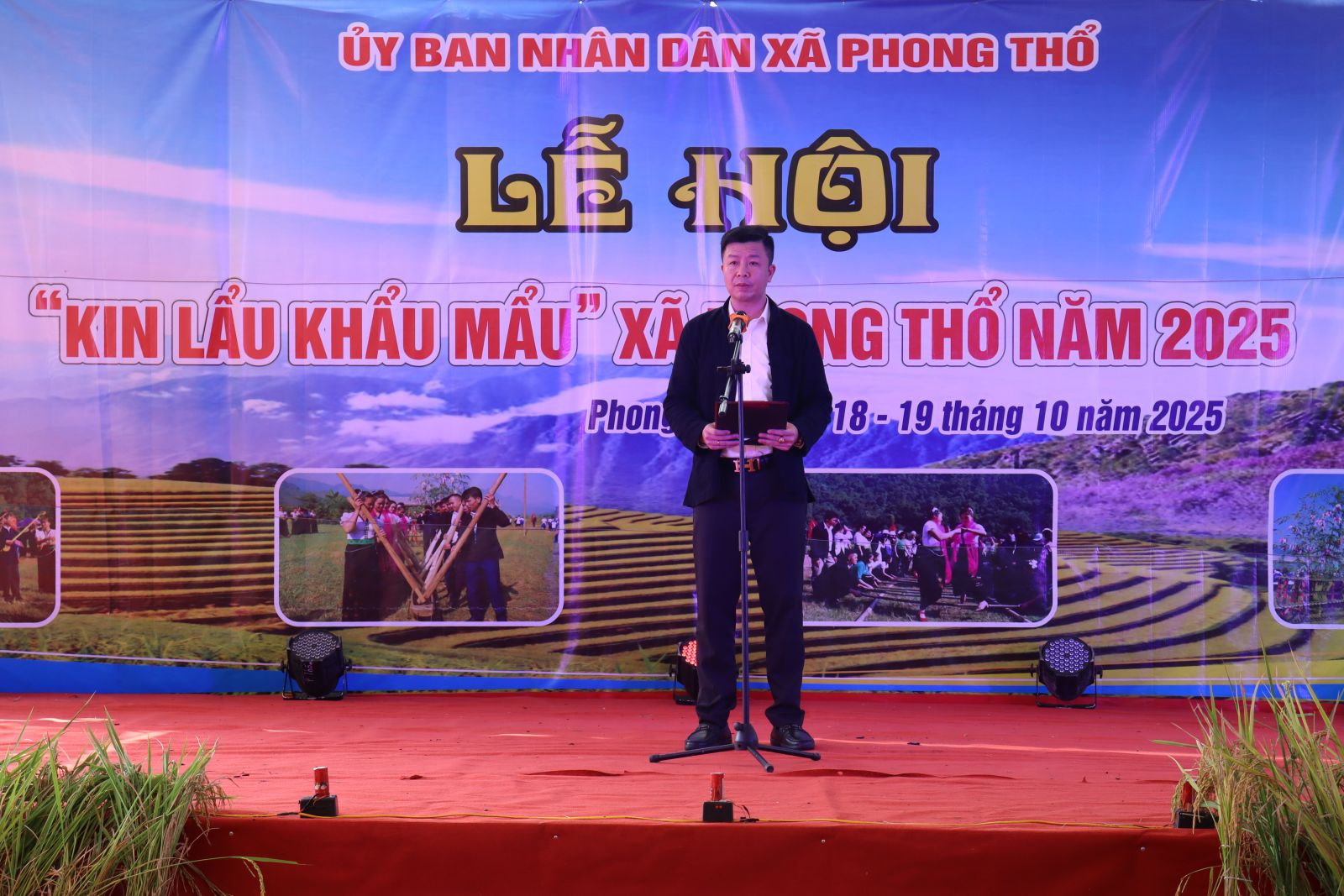 Trong 2 ngày (18-19/10), xã Phong Thổ đã tổ chức Lễ hội “Kin Lẩu Khẩu Mẩu” năm 2025 tại bản Huổi Én. Dự Lễ hội có các đồng chí Trần Mạnh Hùng - UVBCH Đảng bộ tỉnh, Giám đốc Sở Văn hoá; Đinh Quang Tuấn - UVBCH Đảng bộ tỉnh, Bí thư Đảng ủy, Chủ tịch HĐND xã; các đồng chí Thường trực Đảng ủy - HĐND - UBND xã; lãnh đạo một số sở, ngành tỉnh, địa phương cùng đông đảo nhân dân và du khách.