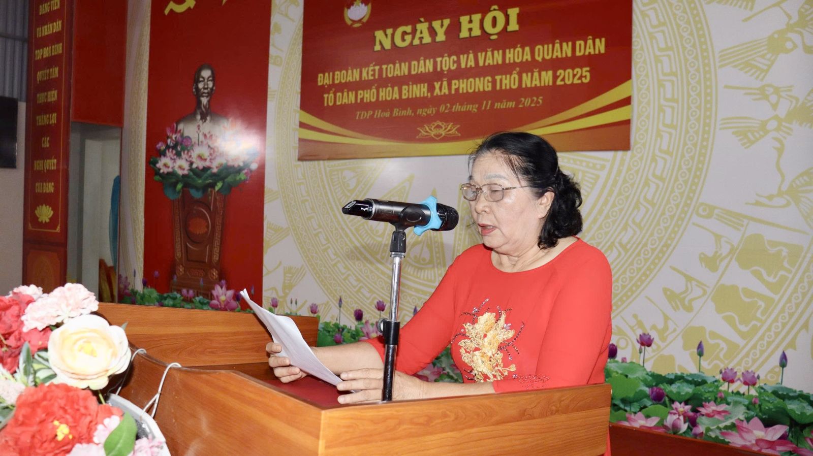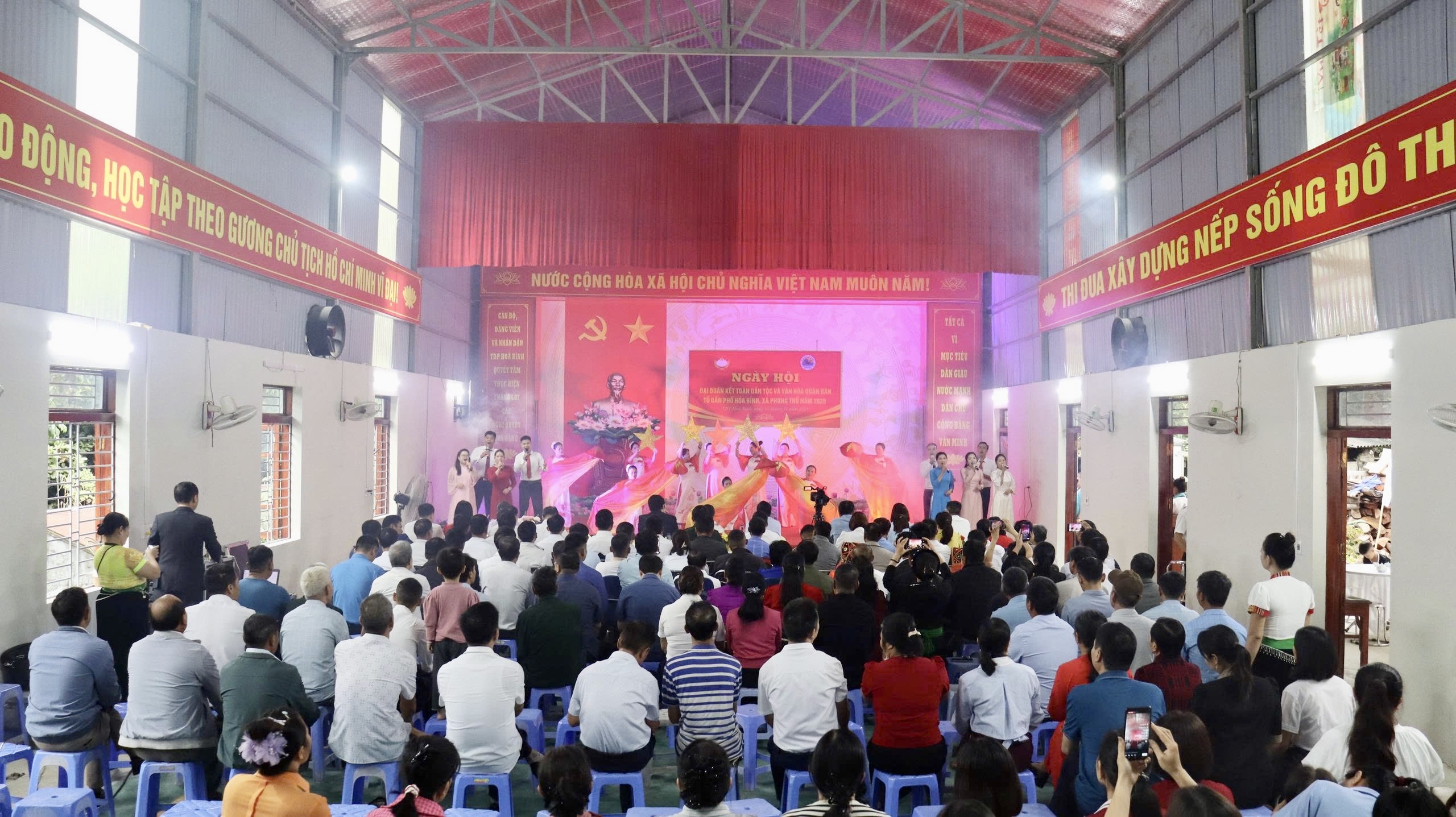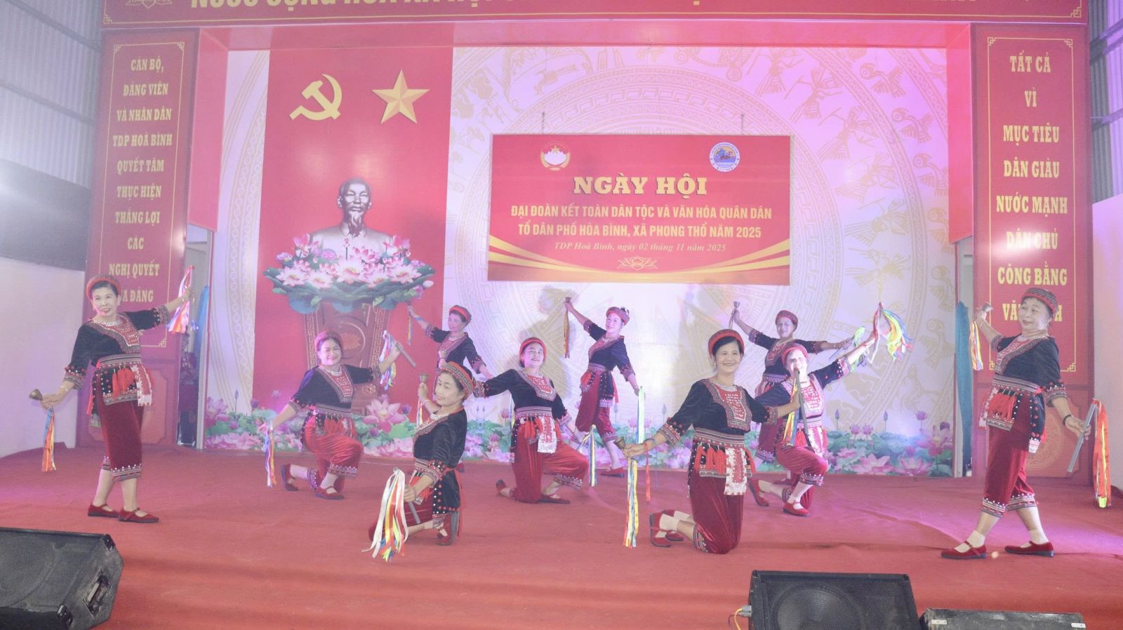 Ngày hội gồm 2 phần: Phần lễ và phần hội. Trong phần lễ, nhân dân TDP cùng các đại biểu đã ôn lại lịch sử truyền thống vẻ vang 95 năm của MTTQ Việt Nam (18/11/1930 - 18/11/2025), nhìn nhận và đánh giá kết quả vận động nhân dân thực hiện chủ trương mô hình chính quyền địa phương 2 cấp; kết quả phát triển kinh tế, xã hội, thực hiện các cuộc vận động, các phong trào thi đua yêu nước, đánh giá khái quát những kết quả đạt được sau 01 năm thực hiện và nhiệm vụ trọng tâm trong năm tới. Theo báo cáo, TDP Hòa Bình hiện có 241 hộ với 851 nhân khẩu với 7 dân tộc anh em cùng sinh sống. Dưới sự lãnh đạo của Đảng Ủy - HĐND - UBND - Ủy ban MTTQ Việt nam các cấp và cấp ủy, Chi bộ, Ban Công tác Mặt trận TDP, nhân dân TDP đã xây dựng khu dân cư ổn định và phát triển khá về mọi mặt. Tình hình chính trị, quân sự, an ninh trên địa bàn ổn định; các chỉ tiêu cấp trên giao đều đạt và vượt, đời sống của nhân dân ngày càng được cải thiện, nâng cao. Tổng thu nhập bình quân đầu người ước đạt 75 triệu đồng/người/năm; tỷ lệ hộ khá, giàu đạt trên 72%; hộ nghèo, hộ cận nghèo giảm còn 3,14%. Năm 2025, TDP Hòa Bình có 235/241 hộ đạt danh hiệu gia đình văn hóa, chiếm tỷ lệ 97,51%; giữ vững danh hiệu TDP văn hóa.