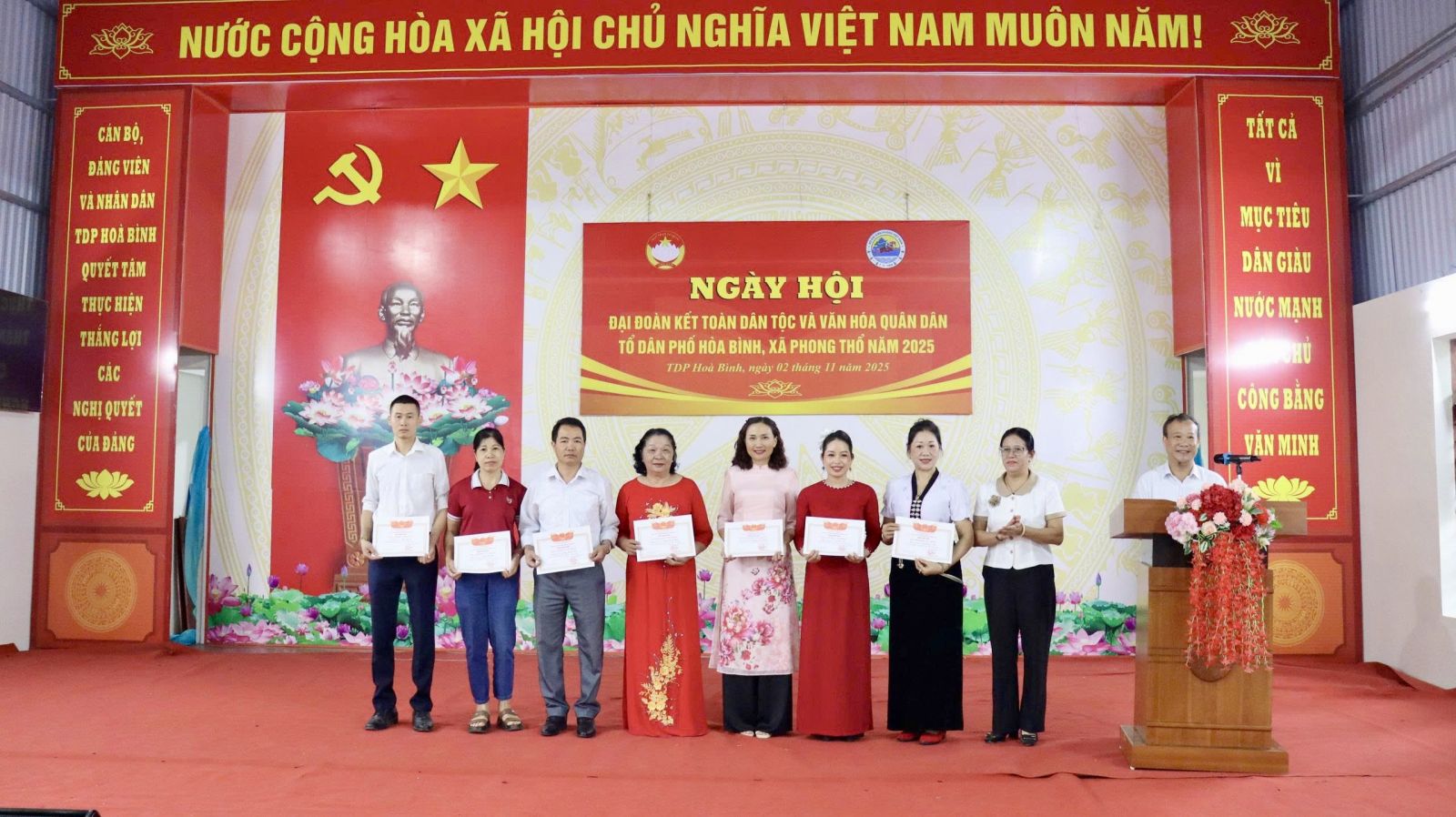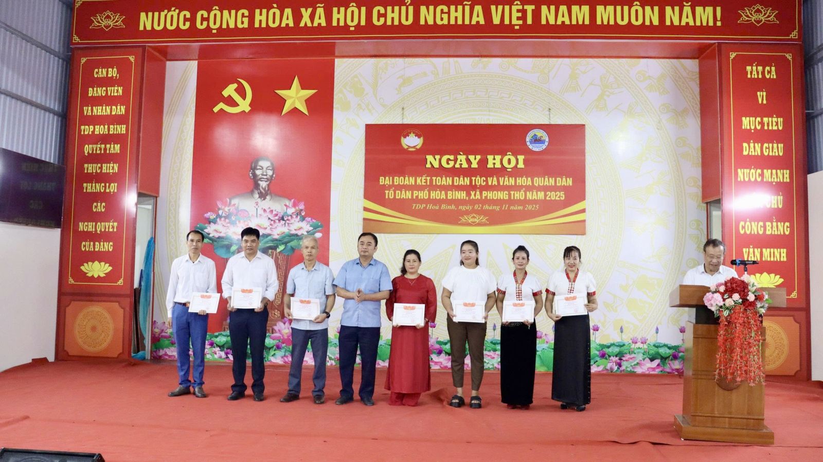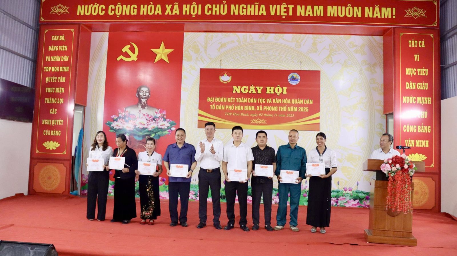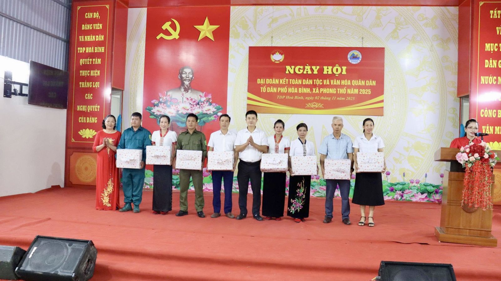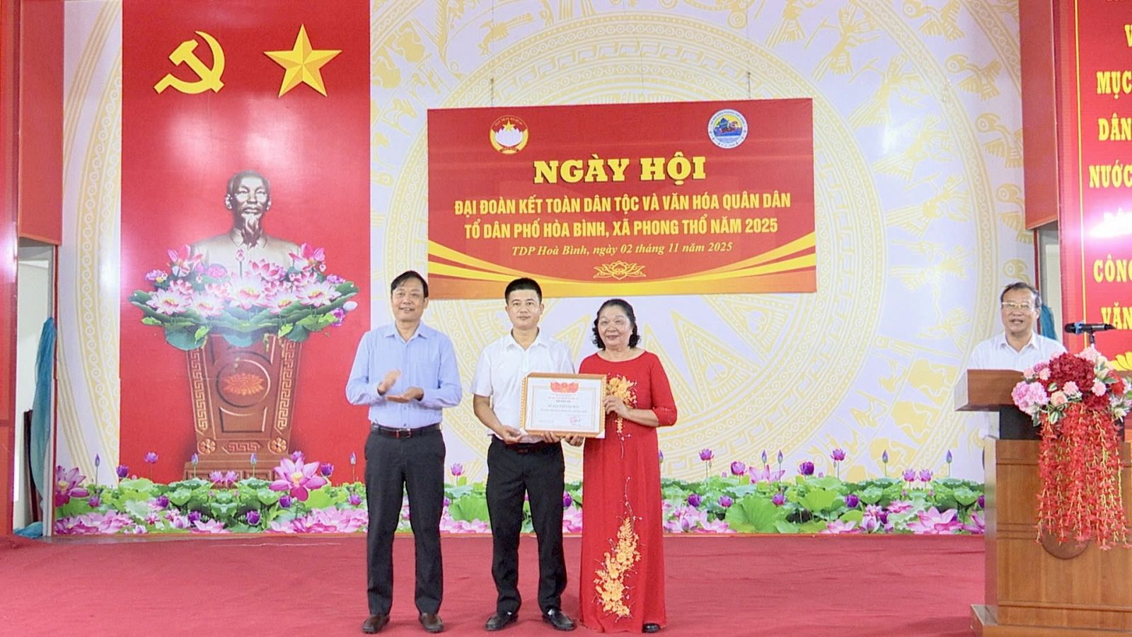 Nhân dịp này, Ban Chỉ đạo phong trào “Toàn dân đoàn kết xây dựng đời sống văn hóa” xã Phong Thổ thông qua Quyết định của Chủ tịch UBND xã công nhận danh hiệu gia đình văn hóa năm 2025 cho 235/241 hộ; quyết định tặng danh hiệu “Thôn, tổ dân phố văn hóa” cho TDP Hòa Bình; Ban Quản lý TDP Hòa Bình tặng quà cho 10 hộ gia đình tiêu biểu trong thực hiện Cuộc vận động “Toàn dân đoàn kết xây dựng nông thôn mới, đô thị văn minh”. Cũng tại Ngày hội, Ban công tác mặt trận TDP Hòa Bình cũng đã phát động hưởng ứng các phong trào thi đua năm 2026.