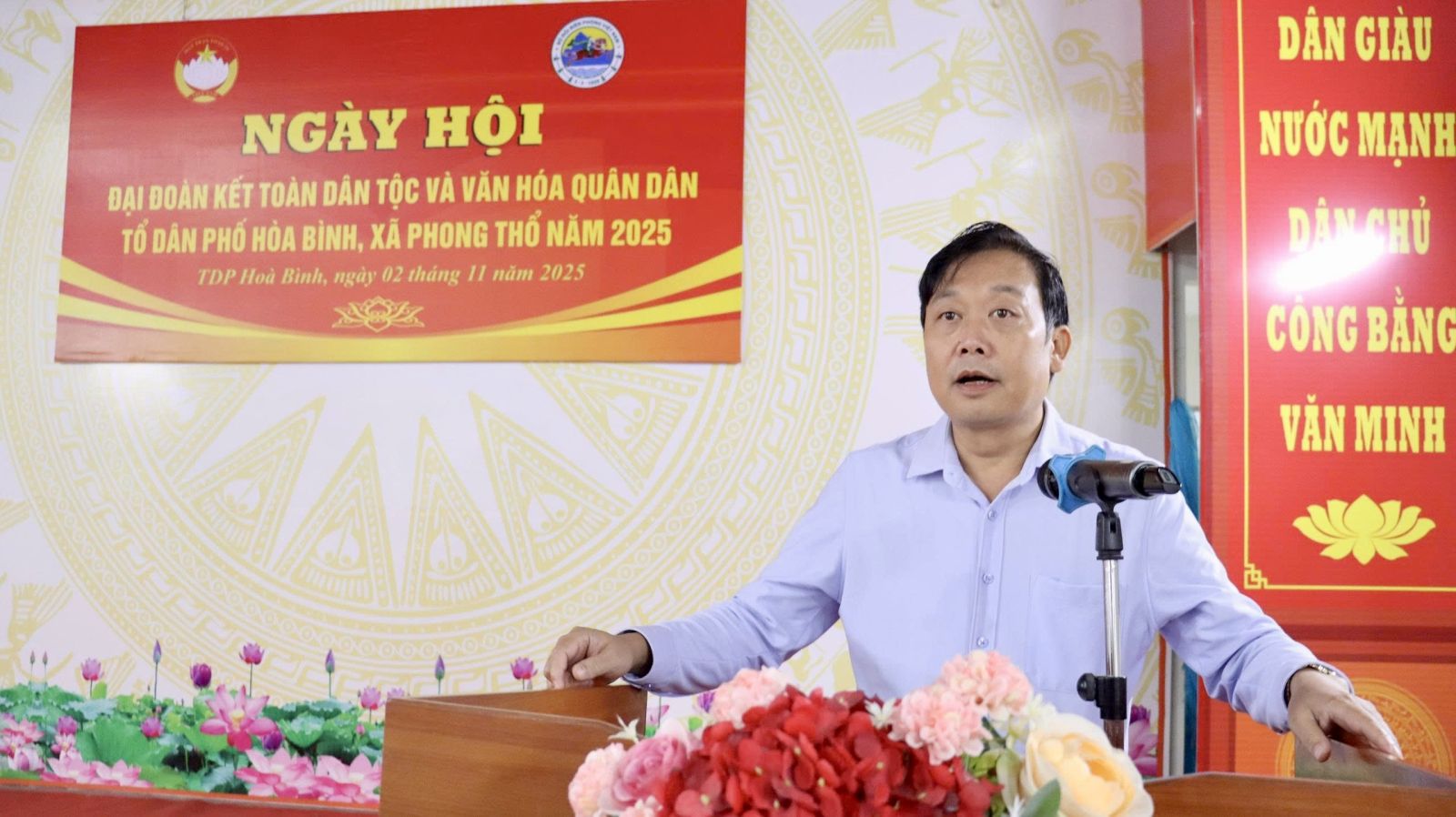 Sáng 02/11, Ban Chỉ đạo phong trào “Toàn dân đoàn kết xây dựng đời sống văn hoá” xã Phong Thổ tổ chức điểm “Ngày hội Đại Đoàn kết toàn dân tộc và văn hóa quân dân” năm 2025 tại tổ dân phố (TDP) Hòa Bình. Dự Ngày hội có đồng chí Đinh Quang Tuấn – Ủy viên Ban Chấp hành Đảng bộ tỉnh, Bí thư Đảng ủy, Chủ tịch HĐND xã; các đồng chí Thường trực Đảng ủy, HĐND, lãnh đạo UBND, Ủy ban MTTQ Việt Nam xã, đại diện các phòng, ban, cơ quan, đơn vị, các doanh nghiệp, hợp tác xã, Bí thư chi bộ, Trưởng các thôn, bản, tổ dân phố và nhân dân TDP Hòa Bình.