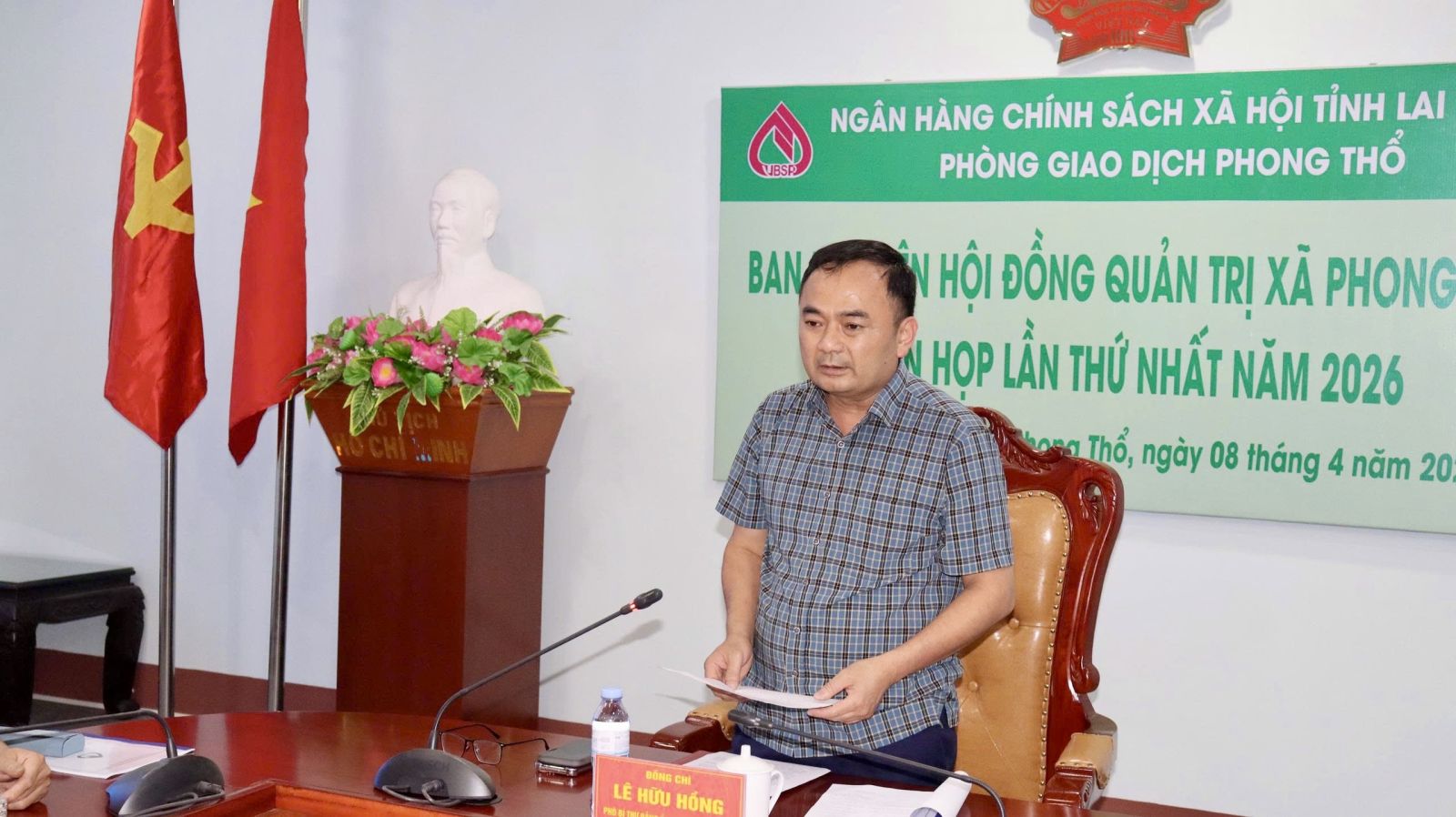 Chiều 8/4, Ban đại diện Hội đồng quản trị Ngân hàng Chính sách xã hội (NHCSXH) xã Phong Thổ tổ chức Phiên họp lần thứ nhất năm 2026 nhằm kiện toàn tổ chức và triển khai các nhiệm vụ trọng tâm trong năm. Đồng chí Lê Hữu Hồng - Phó Bí thư Đảng ủy, Chủ tịch UBND xã, Trưởng Ban đại diện Hội đồng quản trị NHCSXH xã chủ trì phiên họp. Tham dự Phiên họp có đồng chí Lê Quang Ngọc – Giám đốc Phòng giao dịch NHCSXH Phong Thổ; đại diện lãnh đạo các cơ quan, đơn vị, các tổ chức hội, đoàn thể; các đồng chí trong Ban Giám đốc, Tổ trưởng Tổ nghiệp vụ và cán bộ tín dụng Phòng giao dịch NHCSXH Phong Thổ.