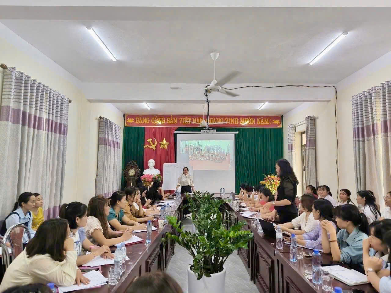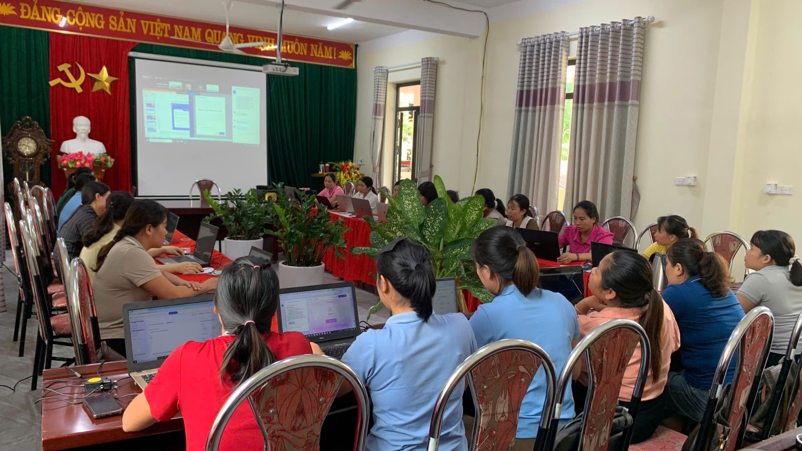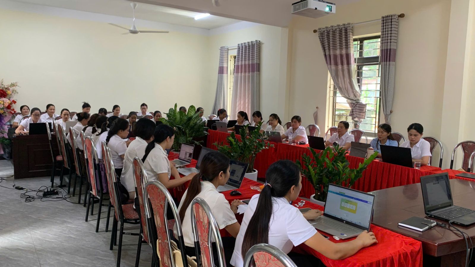 Là trường Mầm non thuộc xã biên giới, điều kiện cơ sở vật chất và hạ tầng mạng còn nhiều hạn chế. Tuy nhiên, Trường Mầm non Hoa Ban đã nỗ lực tận dụng tối đa nguồn lực hiện có, đồng thời tranh thủ sự hỗ trợ từ địa phương và phụ huynh để từng bước xây dựng môi trường giáo dục số. Thực hiện Nghị quyết số 57‑NQ/TW ngày 22/12/2024 của Bộ Chính trị về “đột phá phát triển khoa học, công nghệ, đổi mới sáng tạo và chuyển đổi số quốc gia” và hưởng ứng chủ trương chuyển đổi số của ngành giáo dục, Trường Mầm non Hoa Ban đã triển khai nhiều biện pháp thiết thực nhằm đẩy mạnh ứng dụng công nghệ thông tin trong giảng dạy và học tập. Những ngày đầu triển khai, không ít giáo viên còn bỡ ngỡ khi tiếp cận các phần mềm quản lý hay thiết kế bài giảng điện tử. Tuy nhiên, nhờ sự hỗ trợ tham gia tập huấn các lớp chuyên môn về chuyển đổi số, cùng tinh thần học hỏi, đến nay 100% đội ngũ giáo viên trong trường đã thành thạo việc ứng dụng công nghệ trong công tác chuyên môn.