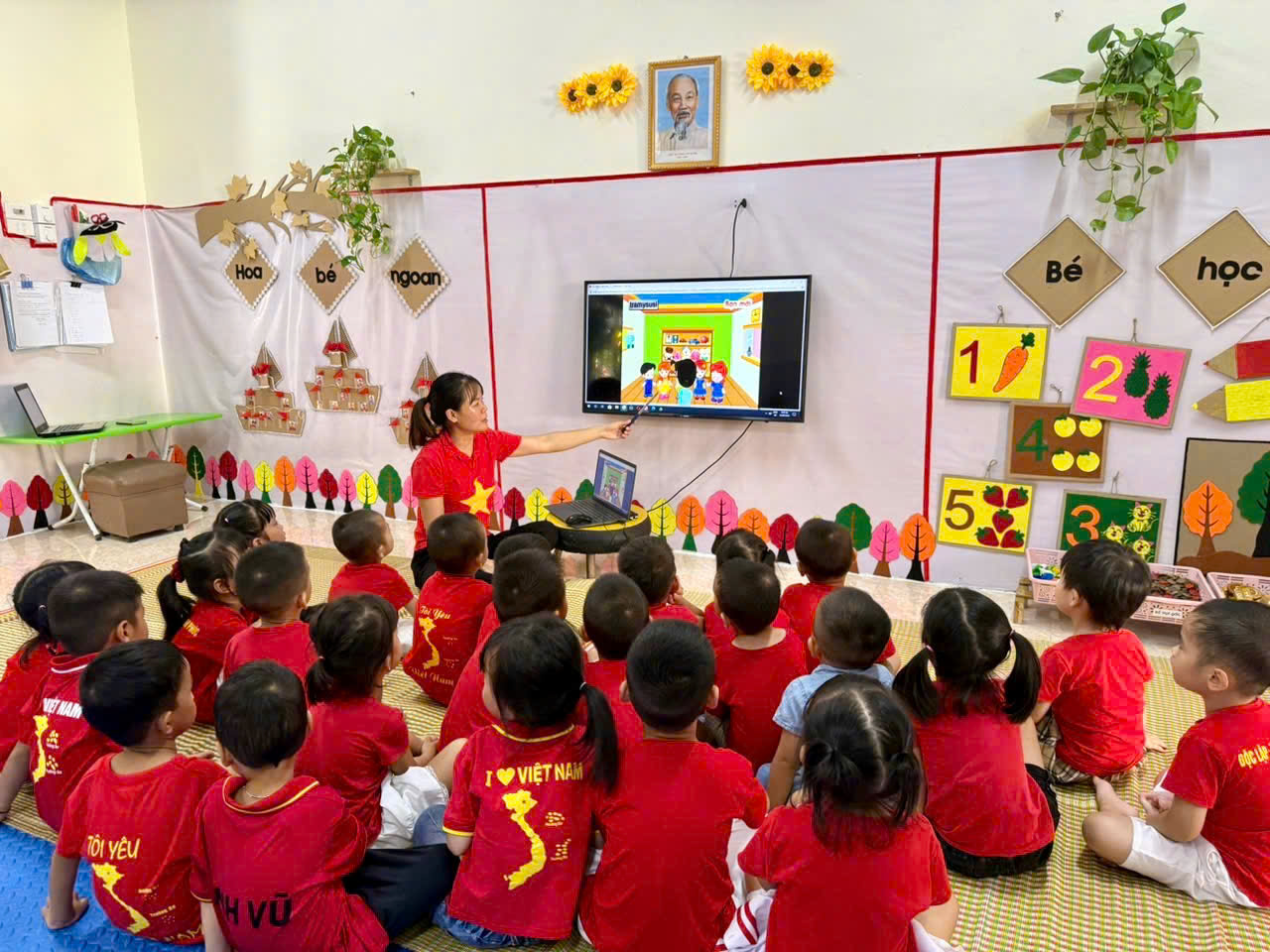 Hành trình chuyển đổi số tại trường Mầm non Hoa Ban bắt đầu từ việc nâng cao năng lực số cho đội ngũ giáo viên. Nếu như trước đây, cô giáo phải ghi chép sổ tay, điểm danh, theo dõi sức khỏe trẻ bằng giấy tờ, thì đến nay thông qua các lớp tập huấn, các cô đã được hướng dẫn và biết cách sử dụng máy tính, phần mềm quản lý, thiết kế bài giảng điện tử và bảo vệ thông tin cá nhân trên môi trường mạng. Chỉ với vài thao tác trên máy tính hoặc điện thoại, giáo viên có thể cập nhật tình hình ăn, ngủ, học, chơi của trẻ mỗi ngày. Các tiết học được thiết kế sinh động hơn nhờ hình ảnh, âm thanh và trò chơi tương tác. Nhà trường cũng chú trọng truyền thông tới phụ huynh, giúp mọi người hiểu rằng công nghệ không thay thế tình yêu thương, mà chỉ là “cầu nối” giúp cô và cha mẹ cùng đồng hành trong việc nuôi dạy trẻ. Cô giáo Nguyễn Thị Dung – Tổ trưởng Tổ mầm non 4 (khối lớp mẫu giáo 5 - 6 tuổi) cho biết: “Việc dạy học kết hợp công nghệ không chỉ giúp giáo viên chúng tôi tiết kiệm thời gian chuẩn bị mà còn tạo ra môi trường học tập phong phú, thân thiện và hiện đại. Trên lớp học chúng tôi thường hay sử dụng bài giảng điện tử, video và hình ảnh trực quan để trẻ vừa học vừa chơi. Nhờ đó, các con hứng thú hơn, chủ động khám phá thế giới xung quanh, phát triển khả năng ngôn ngữ và tư duy tốt hơn. Qua quá trình áp dụng, trẻ mạnh dạn, tự tin và chủ động hơn trong giao tiếp, khám phá thế giới xung quanh. Giáo viên cũng tiết kiệm thời gian soạn giảng, dễ dàng chia sẻ học liệu và kinh nghiệm cho nhau”.