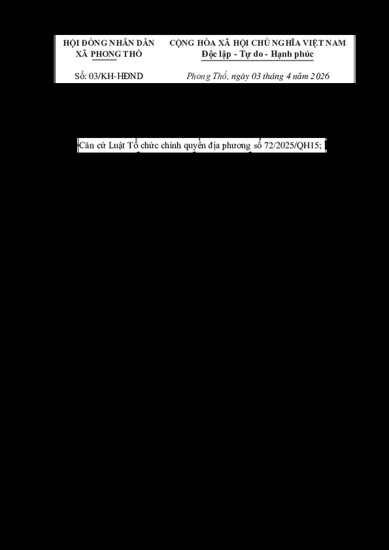 | Số hiệu | Số: 03/KH-HĐND | Cơ quan ban hành | HĐND XÃ PHONG THỔ |