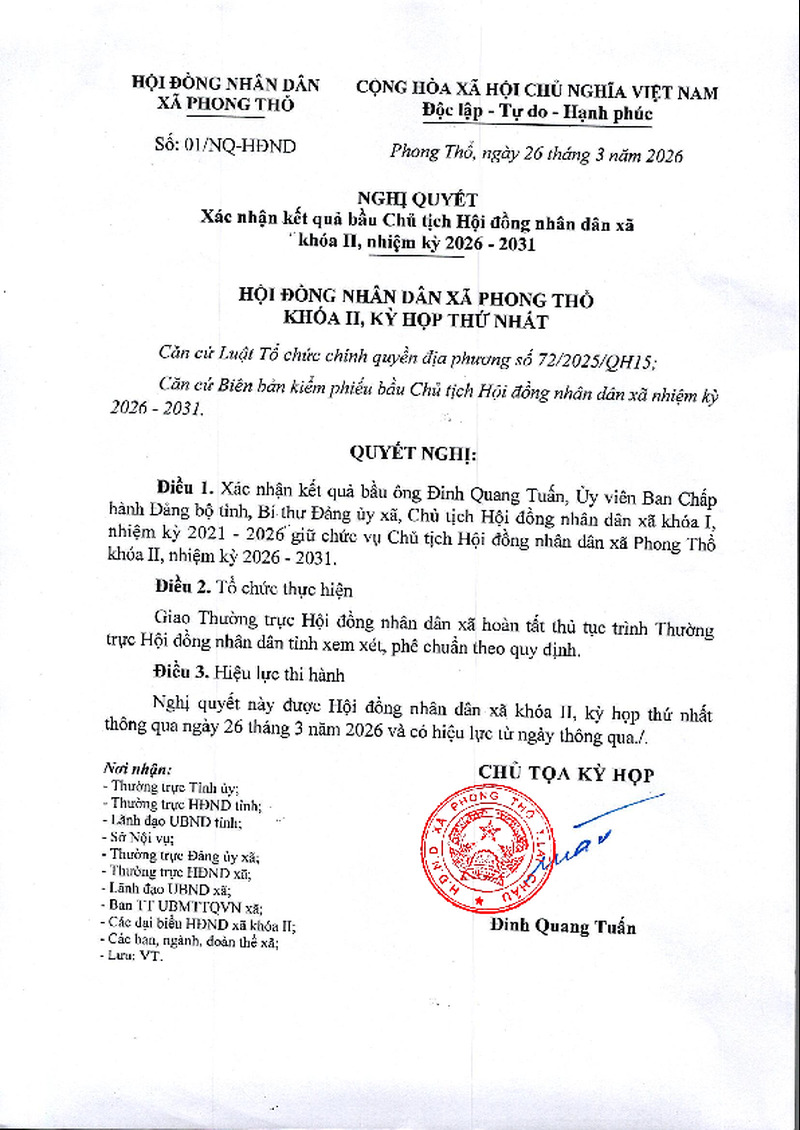 | Số hiệu | Số: 01/NQ-HĐND | Cơ quan ban hành | HĐND XÃ PHONG THỔ |