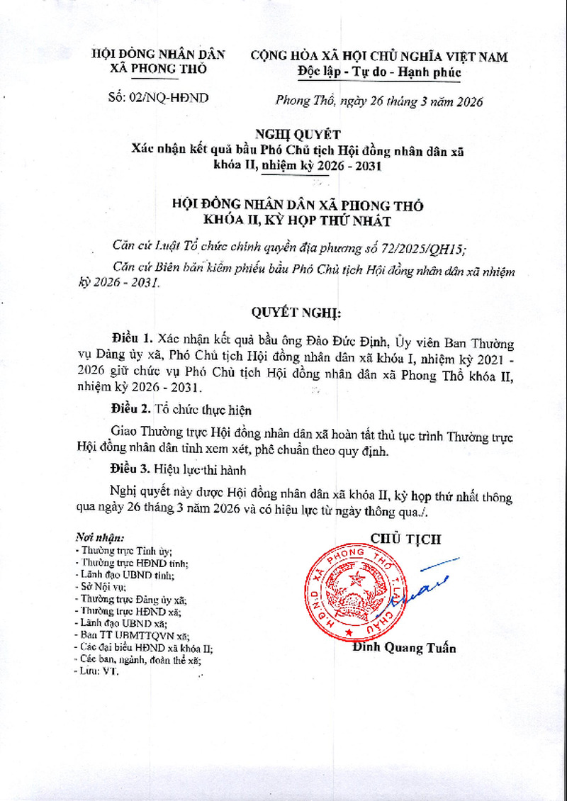 | Tài liệu đính kèm | File đính kèm | Nghị quyết Xác nhận kết quả bầu Phó Chủ tịch Hội đồng nhân dân xã khóa II, nhiệm kỳ 2026 - 2031 | |