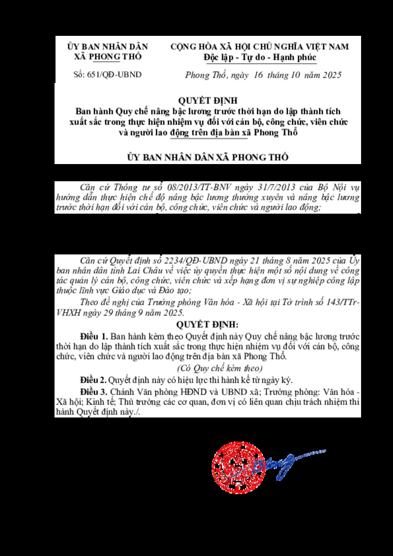 | Tiêu đề văn bản | QUYẾT ĐỊNH Ban hành Quy chế nâng bậc lương trước thời hạn do lập thành tích xuất sắc trong thực hiện nhiệm vụ đối với cán bộ, công chức, viên chức và người lao động trên địa bàn xã Phong Thổ | ||