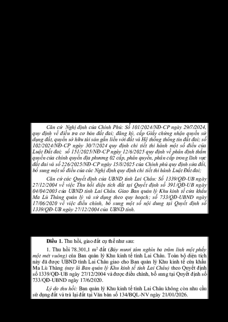 | Tiêu đề văn bản | QUYẾT ĐỊNH Về việc thu hồi đất của Ban quản lý Khu kinh tế Cửa khẩu Ma Lù Thàng (nay là Ban quản lý Khu kinh tế tỉnh Lai Châu); giao đất cho Ủy ban nhân dân xã Phong Thổ quản lý theo quy định | ||