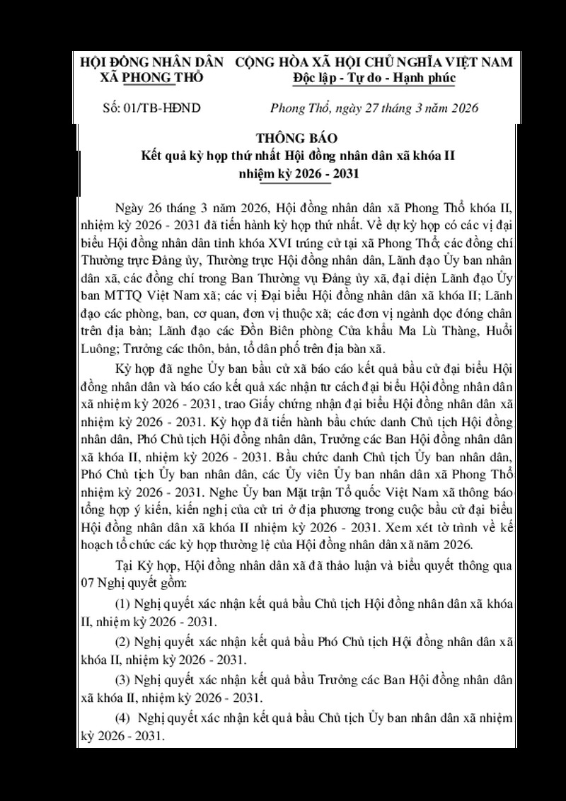 | Số hiệu | Số: 01/TB-HĐND | Cơ quan ban hành | HĐND XÃ PHONG THỔ |